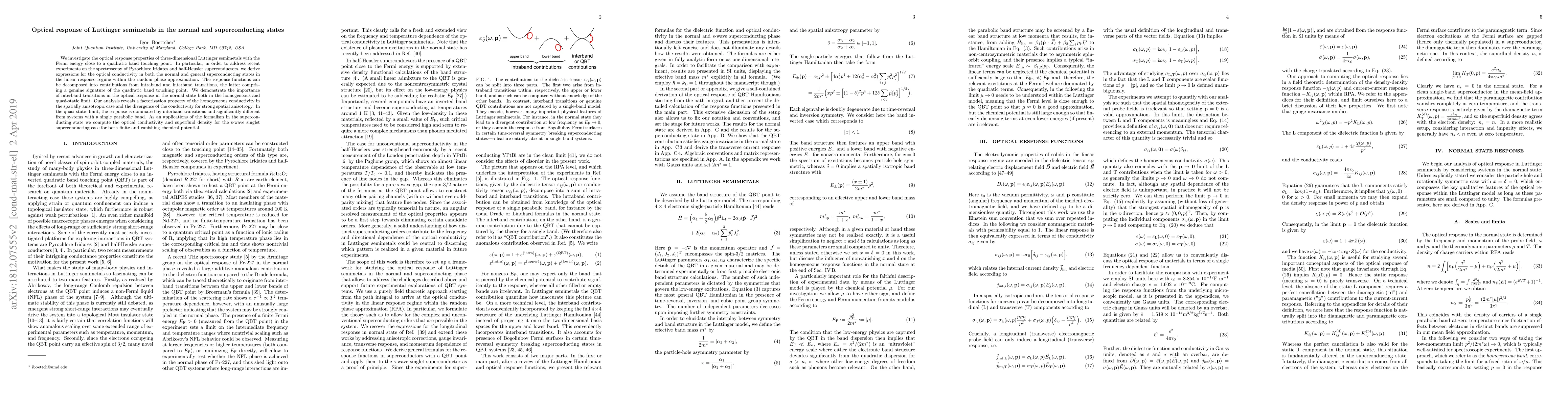 This paper investigates the optical response of three-dimensional Luttinger semimetals, focusing on the contributions from intraband and interband transitions, especially in the normal and superconducting states. It reveals the significance of interband transitions in the normal state and the unique optical properties arising from strong spatial anisotropy and the quadratic band touching point.