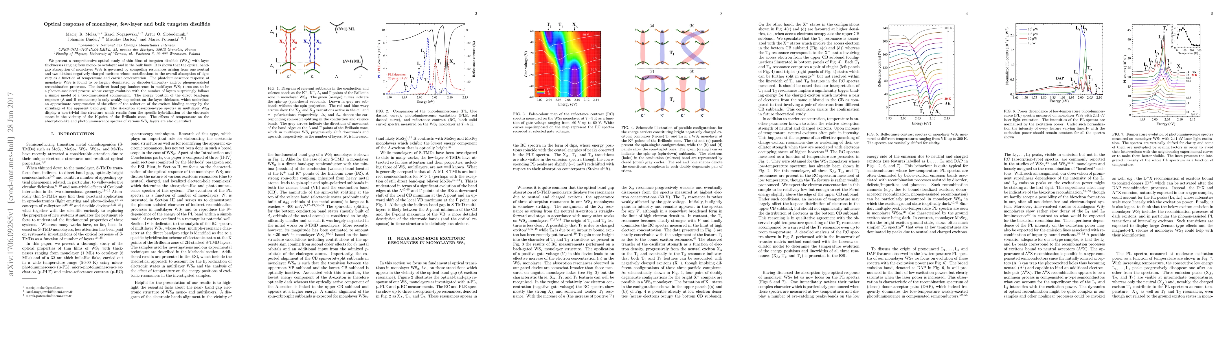 This study investigates the optical properties of tungsten disulfide (WS$_2$) in various thicknesses, revealing that monolayer WS$_2$'s optical band-gap is influenced by excitons, while multilayer WS$_2$'s luminescence is phonon-mediated, with a simple model explaining its two-dimensional confinement. Temperature effects on absorption and photoluminescence spectra are also quantified.