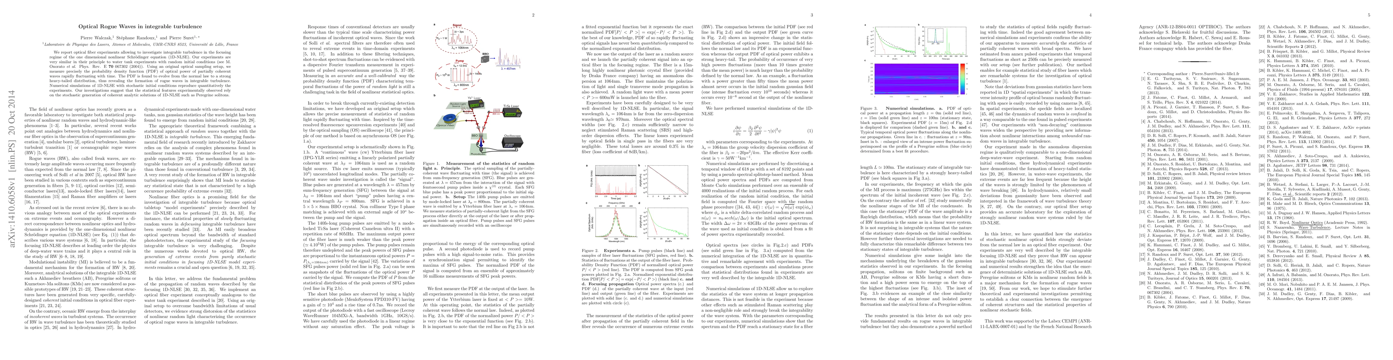 This paper reports optical fiber experiments that investigate integrable turbulence in the focusing regime of the 1D-NLSE, revealing the formation of rogue waves through a heavy-tailed distribution of optical power. Numerical simulations confirm the experimental findings, suggesting that stochastic generation of coherent solutions like Peregrine solitons underpins these statistical features.