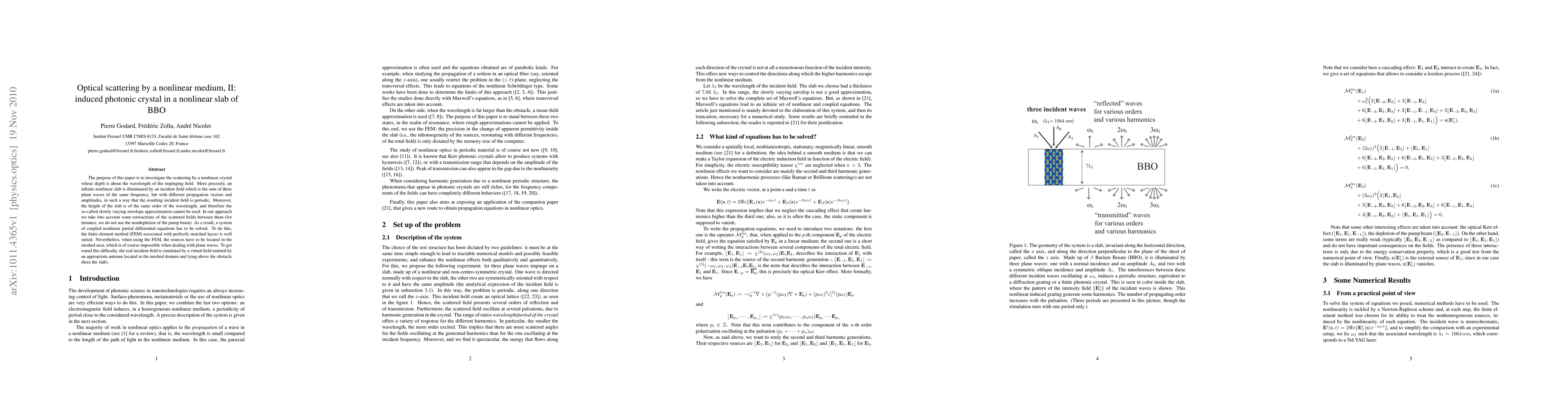 The purpose of this paper is to investigate the scattering by a nonlinear crystal whose depth is about the wavelength of the impinging field. More precisely, an infinite nonlinear slab is illuminated by an incident field which is the sum of three plane waves of the same frequency, but with different propagation vectors and amplitudes, in such a way that the resulting incident field is periodic. Moreover, the height of the slab is of the same order of the wavelength, and therefore the so-called slowly varying envelope approximation cannot be used. In our approach we take into account some retroactions of the scattered fields between them (for instance, we do not use the nondepletion of the pump beam). As a result, a system of coupled nonlinear partial differential equations has to be solved. To do this, the finite element method (FEM) associated with perfectly matched layers is well suited. Nevertheless, when using the FEM, the sources have to be located in the meshed area, which is of course impossible when dealing with plane waves. To get round this difficulty, the real incident field is simulated by a virtual field emitted by an appropriate antenna located in the meshed domain and lying above the obstacle (here the slab).