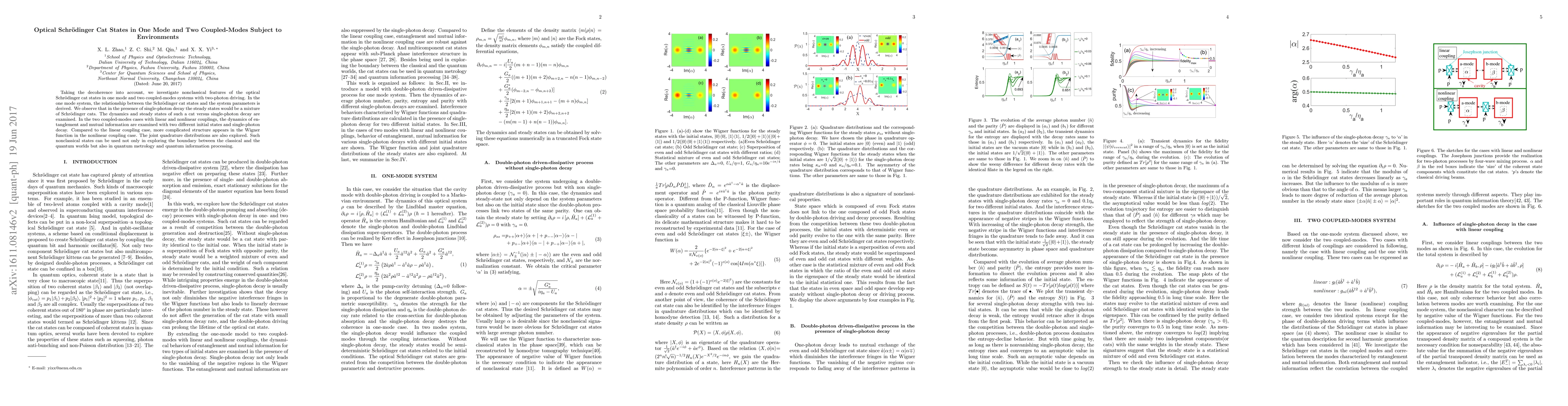 This paper explores the nonclassical features of optical Schrödinger cat states in one-mode and two coupled-mode systems under environmental decoherence, deriving relationships between cat states and system parameters. It examines the dynamics of entanglement and mutual information in coupled-mode systems, revealing more complex structures in nonlinear couplings compared to linear ones.