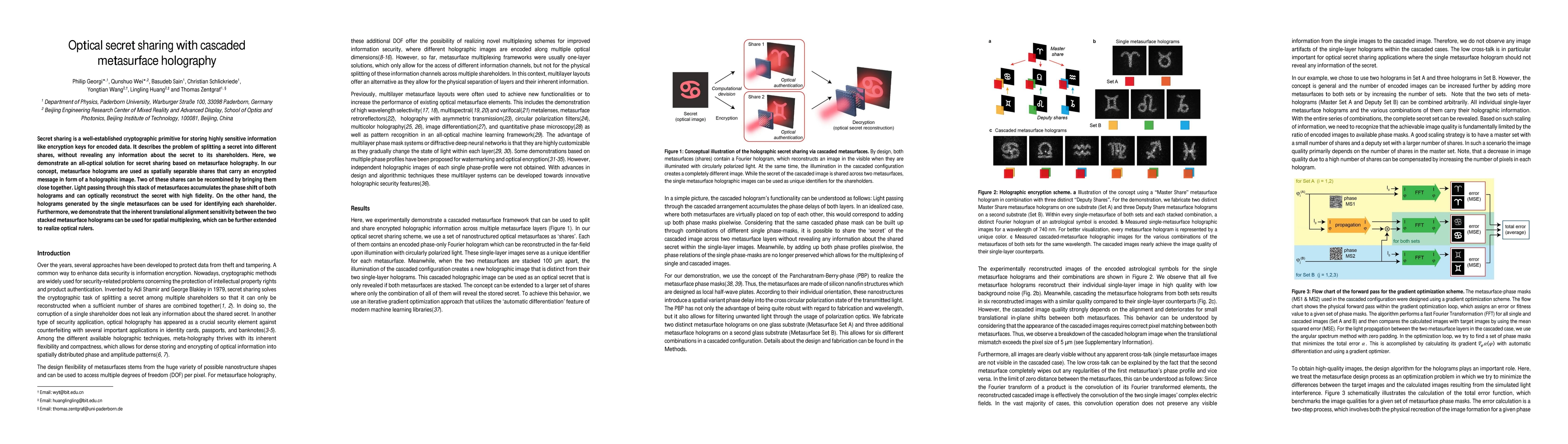 This paper presents an all-optical secret sharing method using cascaded metasurface holography, where encrypted messages are split into holographic shares. The shares can be recombined to reconstruct the secret, while individual shares serve as identifiers, and alignment sensitivity enables spatial multiplexing and potential ruler functionality.