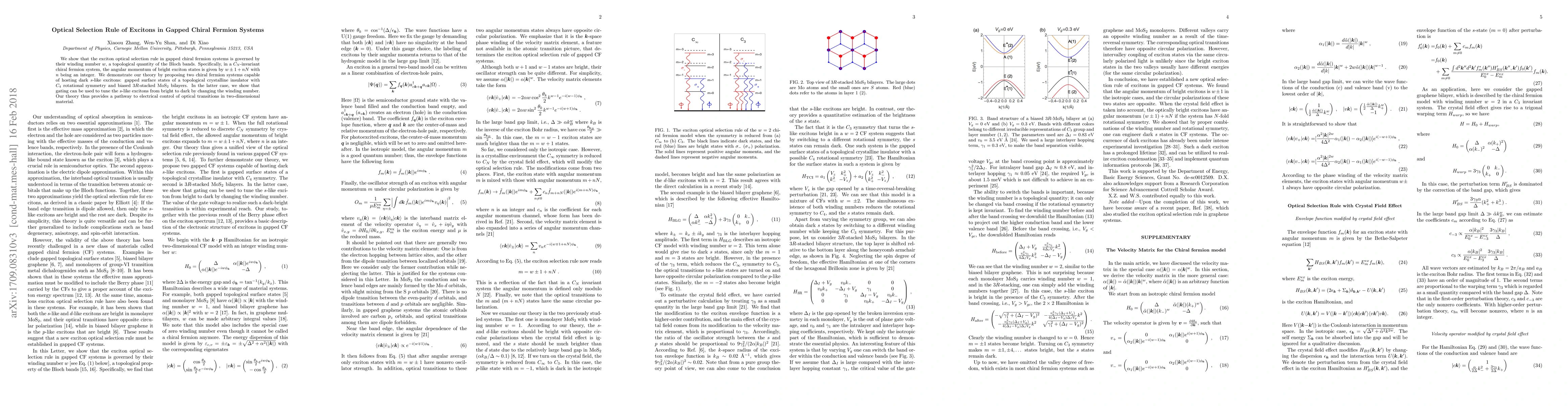 The research establishes that exciton optical selection rules in gapped chiral fermion systems are dictated by their winding number, a topological property of the Bloch bands. The study proposes two systems – topological crystalline insulator surface states with $C_4$ symmetry and biased MoS$_2$ bilayers – that can host dark $s$-like excitons. It demonstrates that gating can switch these excitons' optical properties by altering the winding number, offering a method for electrical control of optical transitions in 2D materials.