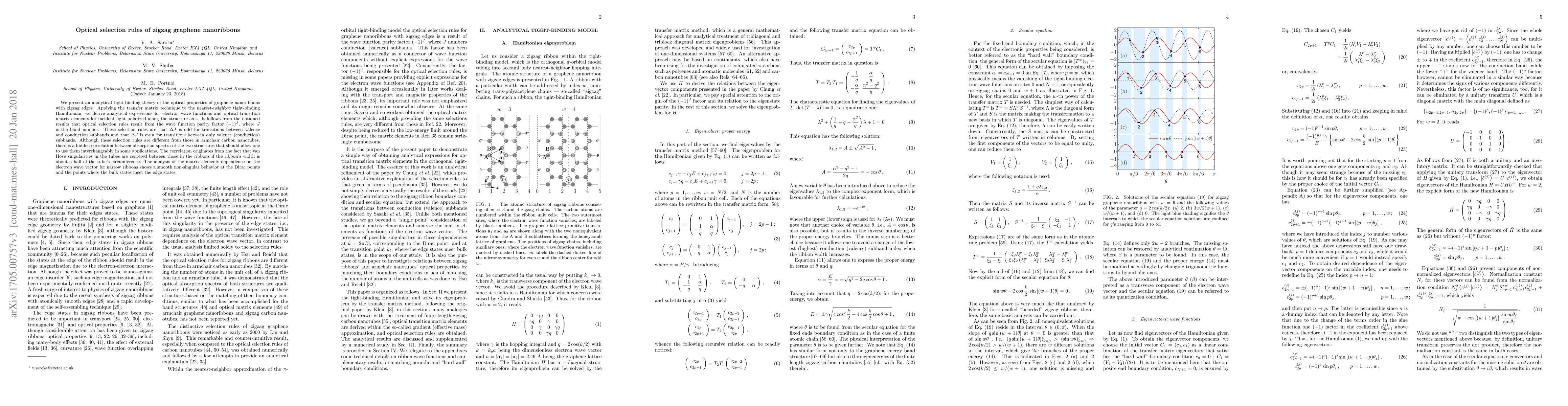 This paper develops an analytical tight-binding theory for the optical properties of zigzag graphene nanoribbons, deriving optical selection rules based on electron wave function parity and showing a hidden correlation between their absorption spectra and those of armchair carbon nanotubes. The analysis reveals smooth behavior of matrix elements at Dirac points and edge states.