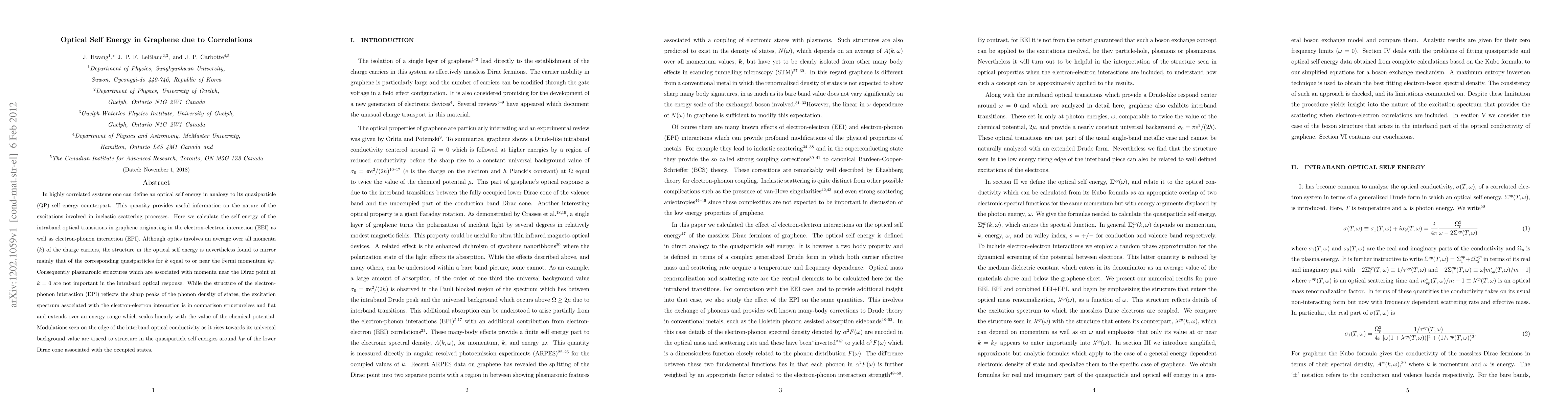 In highly correlated systems one can define an optical self energy in analogy to its quasiparticle (QP) self energy counterpart. This quantity provides useful information on the nature of the excitations involved in inelastic scattering processes. Here we calculate the self energy of the intraband optical transitions in graphene originating in the electron-electron interaction (EEI) as well as electron-phonon interaction (EPI). Although optics involves an average over all momenta ($k$) of the charge carriers, the structure in the optical self energy is nevertheless found to mirror mainly that of the corresponding quasiparticles for $k$ equal to or near the Fermi momentum $k_F$. Consequently plasmaronic structures which are associated with momenta near the Dirac point at $k=0$ are not important in the intraband optical response. While the structure of the electron-phonon interaction (EPI) reflects the sharp peaks of the phonon density of states, the excitation spectrum associated with the electron-electron interaction is in comparison structureless and flat and extends over an energy range which scales linearly with the value of the chemical potential. Modulations seen on the edge of the interband optical conductivity as it rises towards its universal background value are traced to structure in the quasiparticle self energies around $k_F$ of the lower Dirac cone associated with the occupied states.