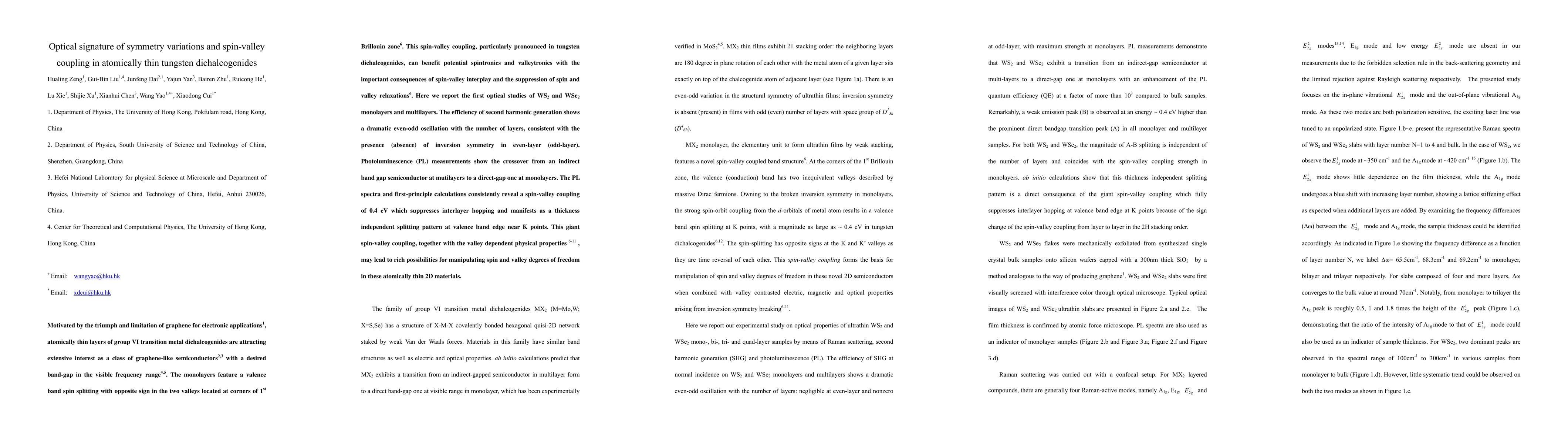 This paper investigates the optical signatures of symmetry variations and spin-valley coupling in tungsten dichalcogenide monolayers and multilayers, revealing significant implications for spintronics and valleytronics. Optical studies highlight a second harmonic generation efficiency oscillation correlating with layer inversion symmetry and a transition from indirect to direct band gap via photoluminescence, alongside a 0.4 eV spin-valley coupling that influences interlayer interactions.