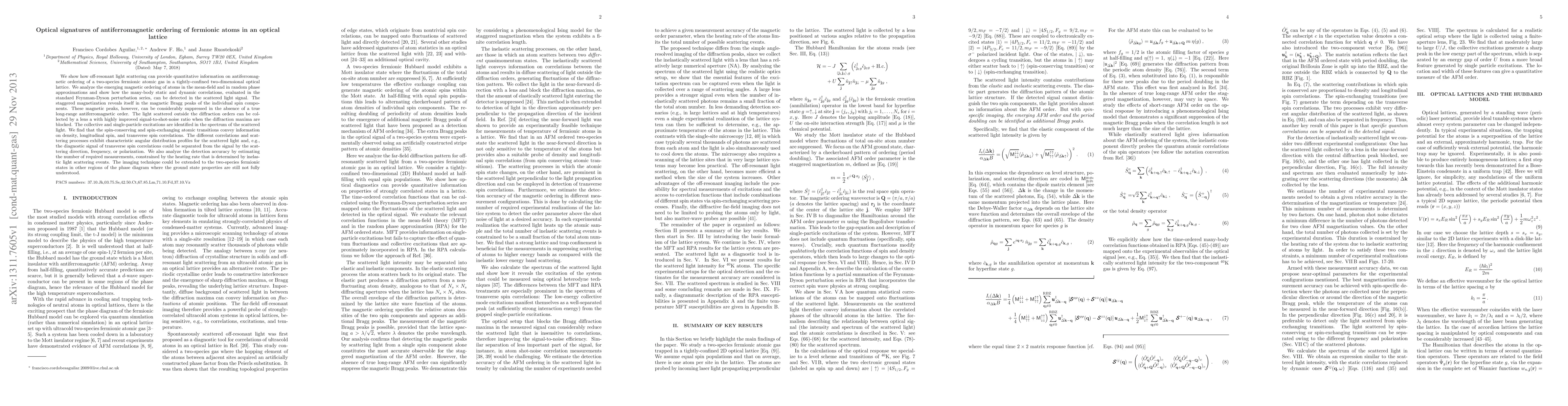 We show how off-resonant light scattering can provide quantitative information on antiferromagnetic ordering of a two-species fermionic atomic gas in a tightly-confined two-dimensional optical lattice. We analyze the emerging magnetic ordering of atoms in the mean-field and in random phase approximations and show how the many-body static and dynamic correlations, evaluated in the standard Feynman-Dyson perturbation series, can be detected in the scattered light signal. The staggered magnetization reveals itself in the magnetic Bragg peaks of the individual spin components. These magnetic peaks, however, can be considerably suppressed in the absence of a true long-range antiferromagnetic order. The light scattered outside the diffraction orders can be collected by a lens a with highly improved signal-to-shot-noise ratio when the diffraction maxima are blocked. The collective and single-particle excitations are identified in the spectrum of the scattered light. We find that the spin-conserving and spin-exchanging atomic transitions convey information on density, longitudinal spin, and transverse spin correlations. The different correlations and scattering processes exhibit characteristic angular distribution profiles for the scattered light and, e.g., the diagnostic signal of transverse spin correlations could be separated from the signal by the scattering direction, frequency, or polarization. We also analyze the detection accuracy by estimating the number of required measurements, constrained by the heating rate that is determined by inelastic light scattering events. The imaging technique could be extended to the two-species fermionic states in other regions of the phase diagram where the ground state properties are still not fully understood.