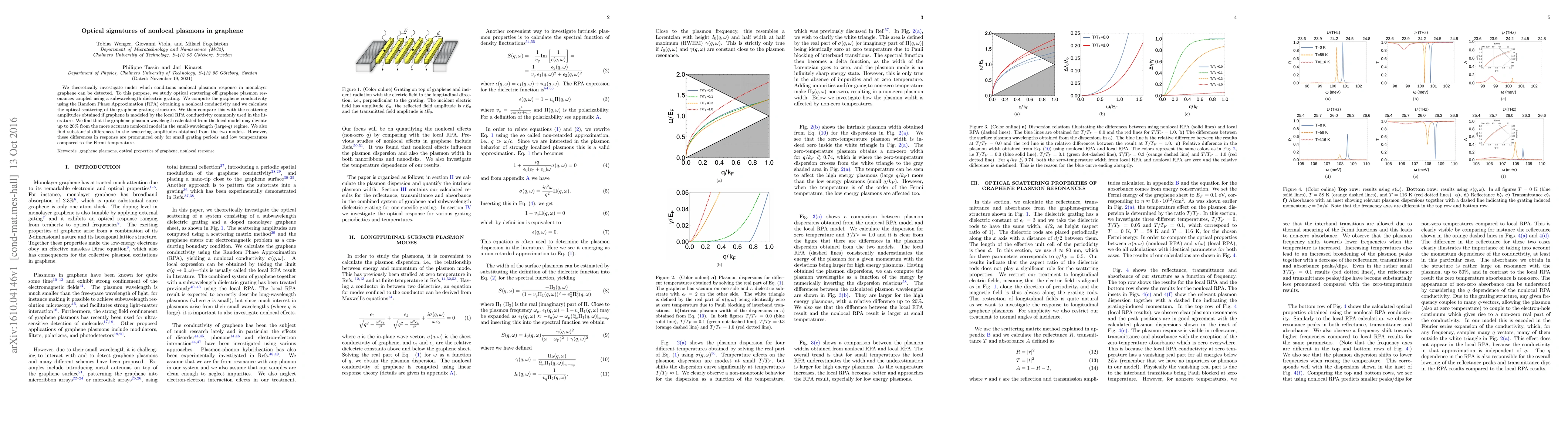 This paper investigates the optical signatures of nonlocal plasmons in graphene using a subwavelength dielectric grating, finding significant deviations in plasmon wavelength and scattering amplitudes when compared to local models, especially for small grating periods and low temperatures.
