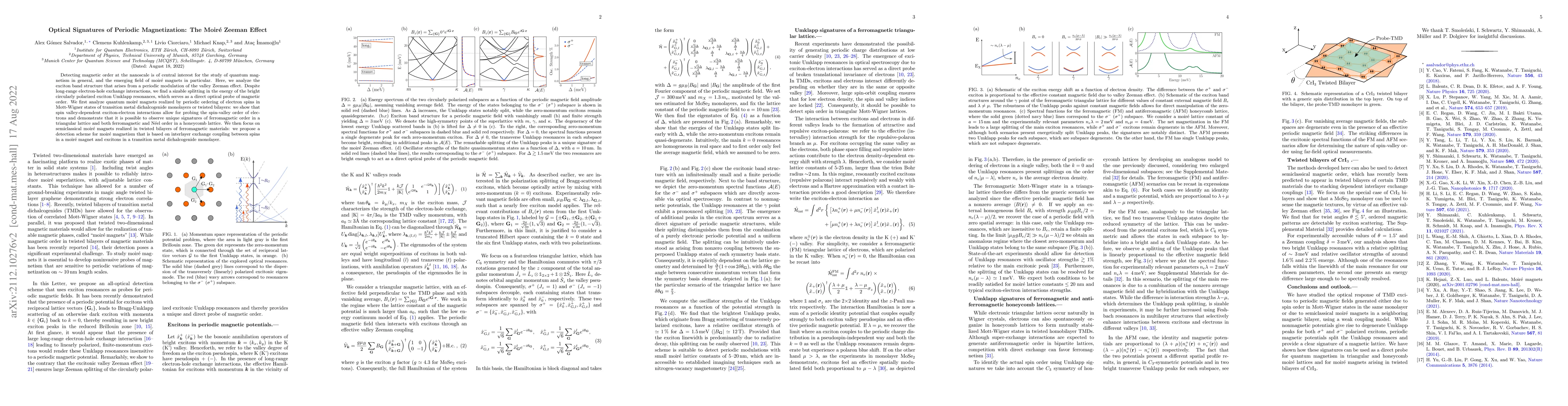 This paper investigates the optical signatures of periodic magnetization in moiré magnets, revealing a significant splitting in the energy of bright circularly-polarized exciton Umklapp resonances as a direct optical probe of magnetic order. It demonstrates unique signatures of magnetic order in triangular and honeycomb lattices, proposing a detection scheme based on inter-layer exchange coupling in twisted bilayers.