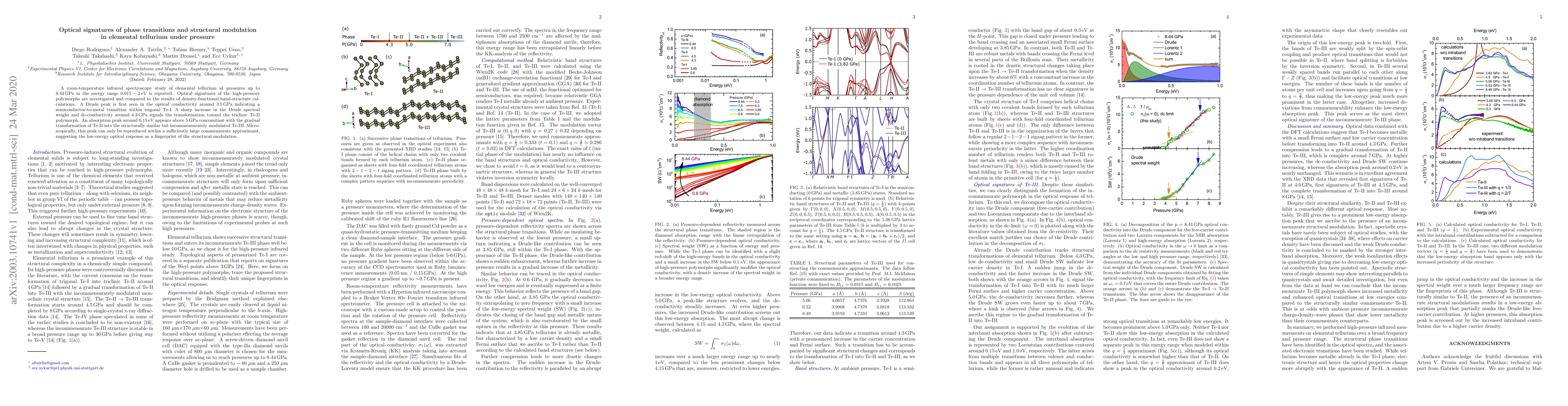 This study investigates the optical signatures of phase transitions in tellurium under high pressure using infrared spectroscopy, revealing a semiconductor-to-metal transition and structural modulations. The Drude peak indicates a transition at 3.5 GPa, while a sharp increase at 4.3 GPa signals a transformation to a triclinic polymorph, and an absorption peak at 0.15 eV above 5 GPa marks the modulation of the structurally similar Te-III phase.