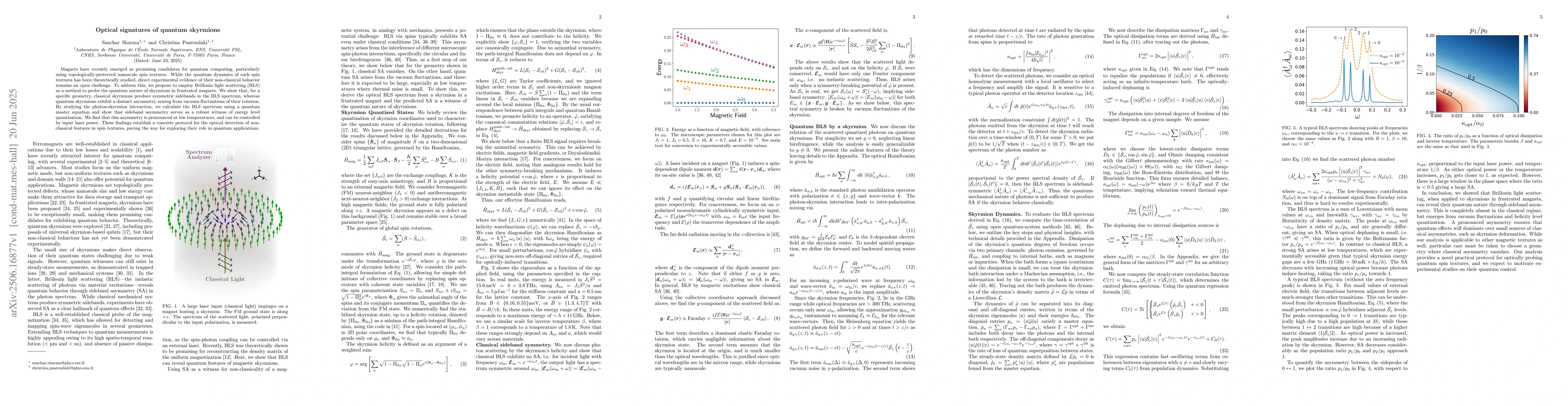 The research proposes using Brillouin Light Scattering (BLS) to detect quantum properties of skyrmions in magnets, key elements for quantum computing. It shows that quantum skyrmions, unlike classical ones, display asymmetry in BLS spectra due to vacuum fluctuations, serving as evidence of energy level quantization, especially noticeable at low temperatures and controllable via laser power.