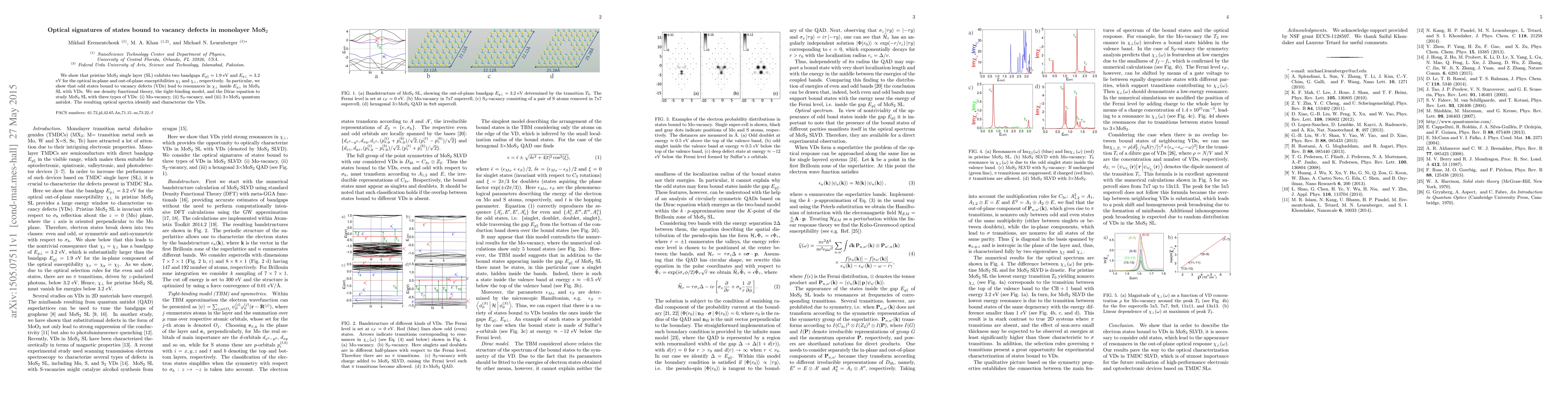 This paper investigates the optical signatures of vacancy defects in monolayer MoS$_2$, revealing two distinct bandgaps and identifying resonances in optical susceptibilities due to defect states. Using density functional theory and other models, it characterizes three types of vacancy defects and their corresponding optical spectra.
