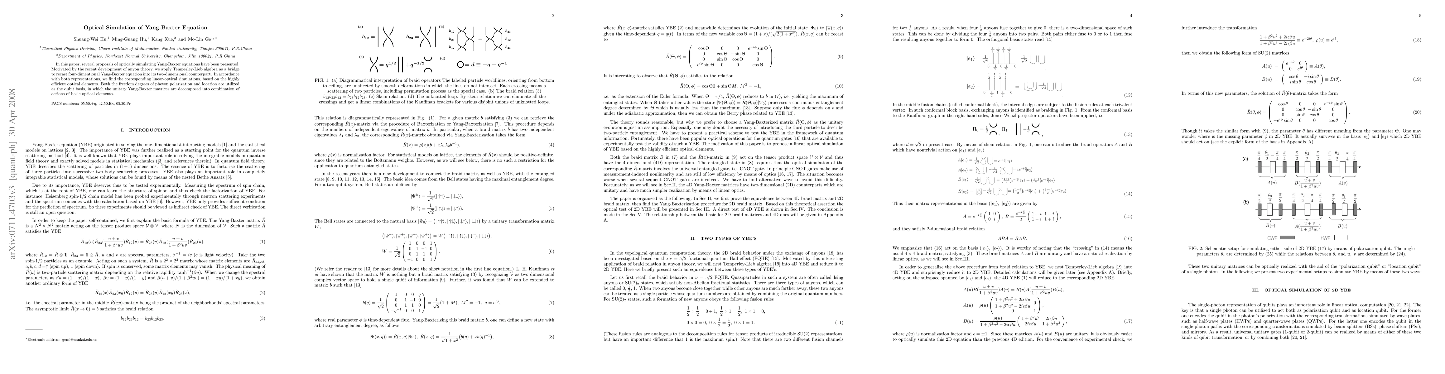 In this paper, several proposals of optically simulating Yang-Baxter equations have been presented. Motivated by the recent development of anyon theory, we apply Temperley-Lieb algebra as a bridge to recast four-dimentional Yang-Baxter equation into its two-dimensional counterpart. In accordance with both representations, we find the corresponding linear-optical simulations, based on the highly efficient optical elements. Both the freedom degrees of photon polarization and location are utilized as the qubit basis, in which the unitary Yang-Baxter matrices are decomposed into combination of actions of basic optical elements.