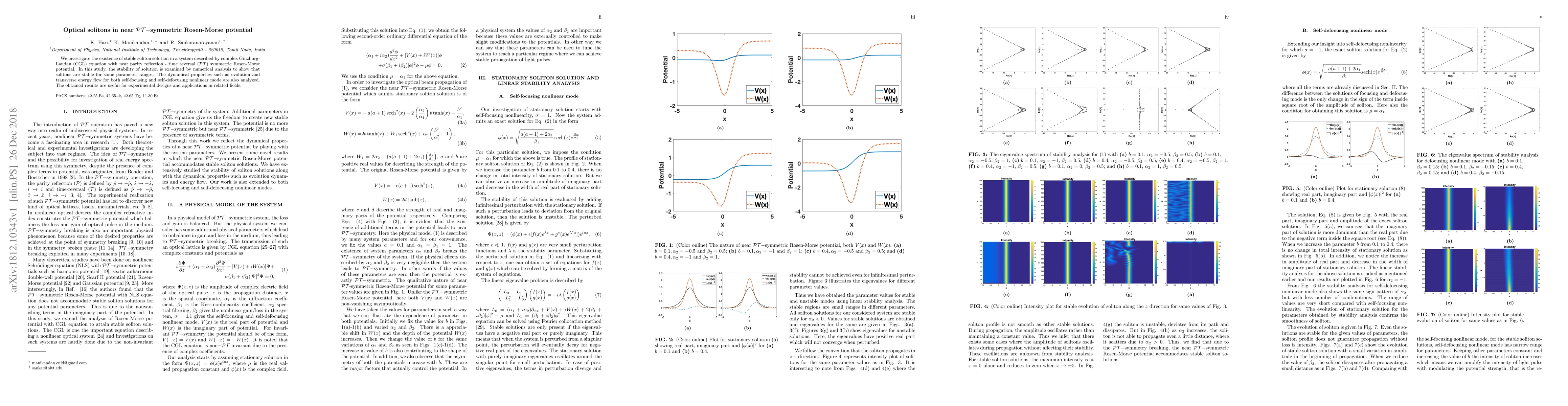 We investigate the existence of stable soliton solution in a system described by complex Ginzburg-Landau (CGL) equation with near parity reflection - time reversal ($\mathcal{PT}$) symmetric Rosen-Morse potential. In this study, the stability of solution is examined by numerical analysis to show that solitons are stable for some parameter ranges. The dynamical properties such as evolution and transverse energy flow for both self-focusing and self-defocusing nonlinear mode are also analyzed. The obtained results are useful for experimental designs and applications in related fields.