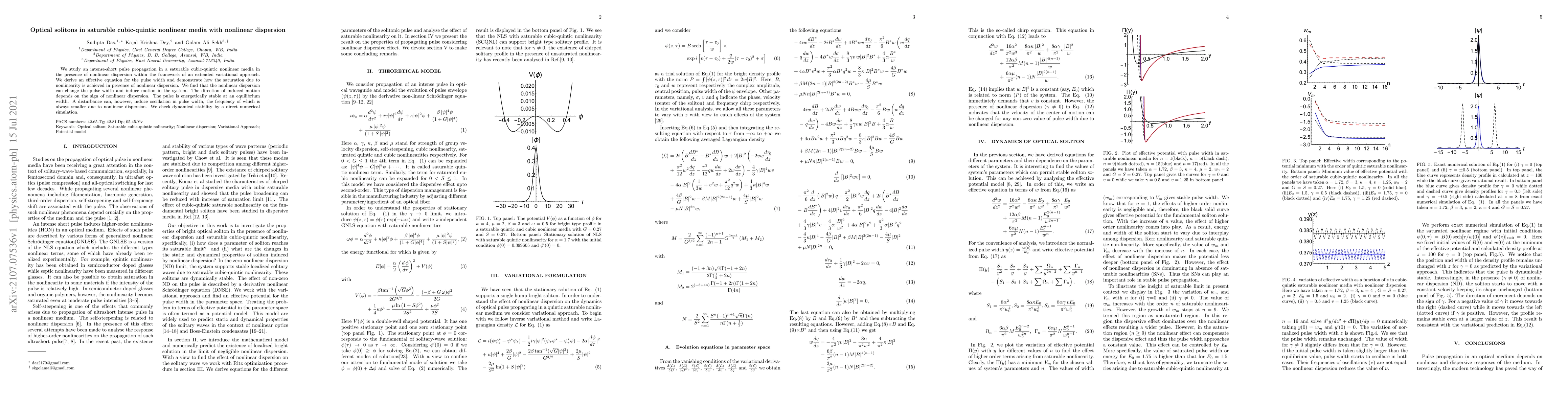 We study an intense-short pulse propagation in a saturable cubic-quintic nonlinear media in the presence of nonlinear dispersion within the framework of an extended variational approach. We derive an effective equation for the pulse width and demonstrate how the saturation due to nonlinearity is achieved in presence of nonlinear dispersion. We find that the nonlinear dispersion can change the pulse width and induce motion in the system. The direction of induced motion depends on the sign of nonlinear dispersion. The pulse is energetically stable at an equilibrium width. A disturbance can, however, induce oscillation in pulse width, the frequency of which is always smaller due to nonlinear dispersion. We check dynamical stability by a direct numerical simulation.