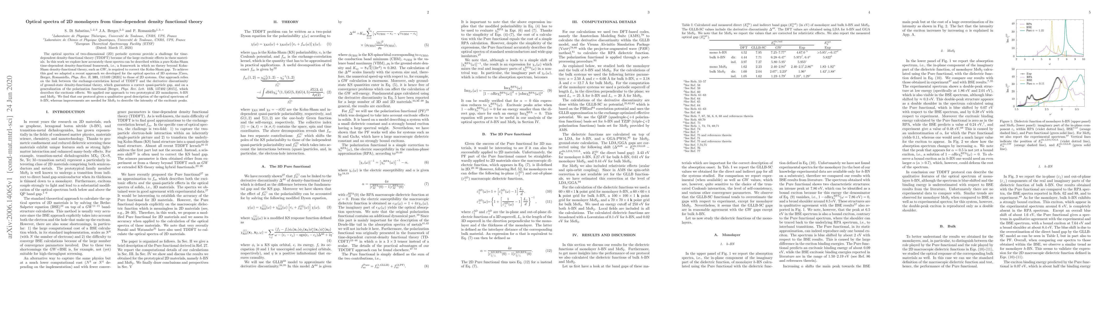 This paper investigates the optical spectra of 2D monolayers using time-dependent density functional theory (TDDFT) without additional corrections. The authors adapt their approach from 3D systems to 2D materials, achieving a good qualitative description of $h$-BN's spectrum but requiring improvements for MoS$_2$ to accurately capture excitonic peak intensities.