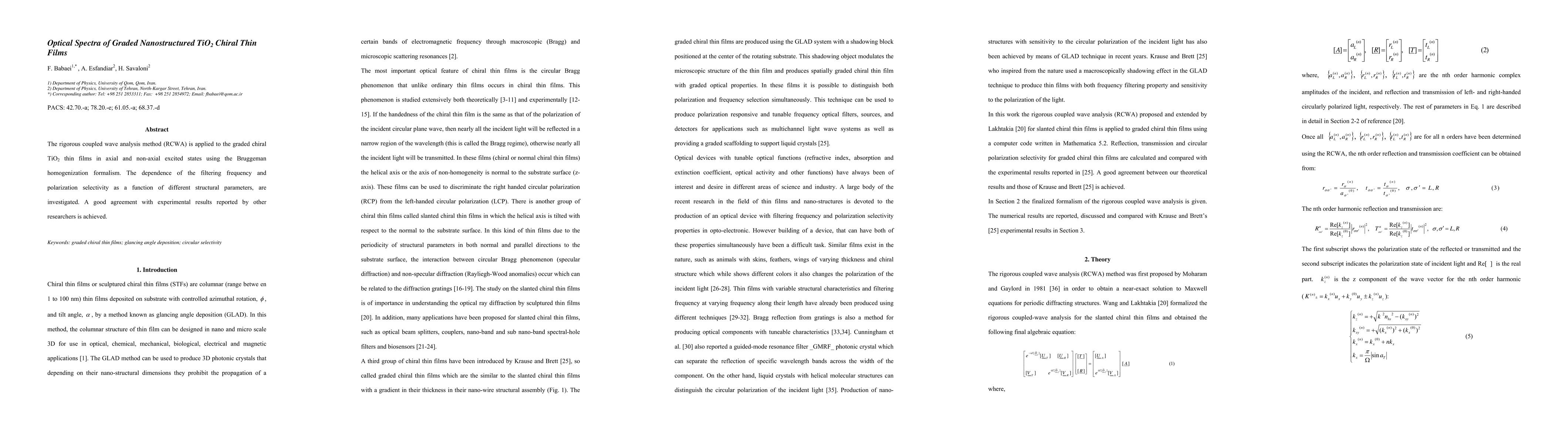 The rigorous coupled wave analysis method (RCWA) is applied to the graded chiral TiO2 thin films in axial and non-axial excited states using the Bruggeman homogenization formalism. The dependence of the filtering frequency and polarization selectivity as a function of different structural parameters, are investigated. A good agreement with experimental results reported by other researchers is achieved.