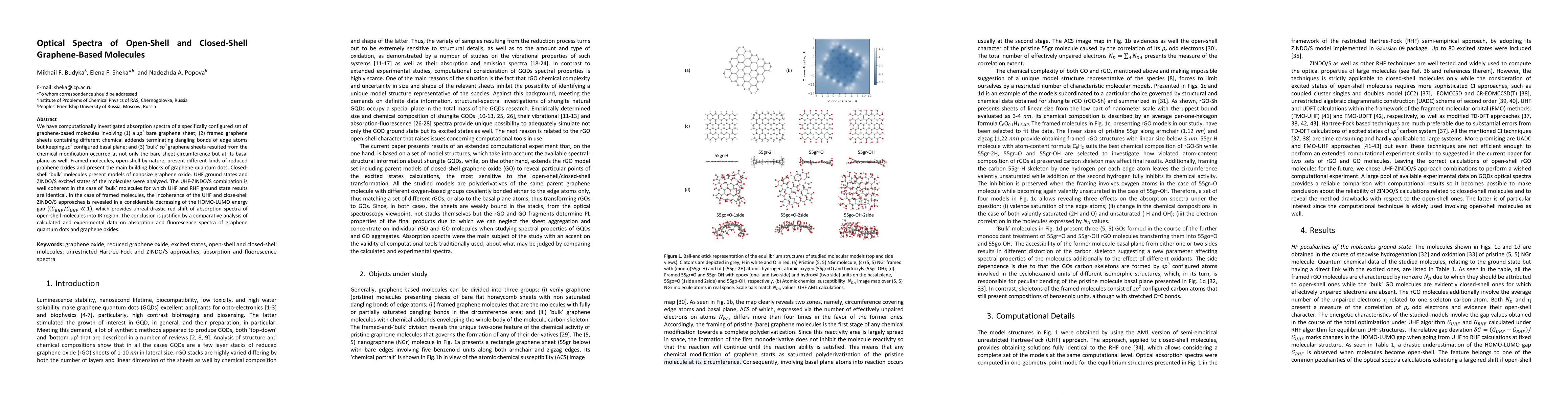 We have computationally investigated absorption spectra of a specifically configured set of graphene-based molecules involving (1) a sp2 bare graphene sheet; (2) framed graphene sheets containing different chemical addends terminating dangling bonds of edge atoms but keeping sp2 configured basal plane; and (3) bulk sp3 graphene sheets resulted from the chemical modification occurred at not only the bare sheet circumference but at its basal plane as well. Framed molecules, open-shell by nature, present different kinds of reduced graphene oxides and present the main building blocks of graphene quantum dots. Closed-shell bulk molecules present models of nanosize graphene oxide. UHF ground states and ZINDO/S excited states of the molecules were analyzed. The UHF-ZINDO/S combination is well coherent in the case of bulk molecules for which UHF and RHF ground state results are identical. In the case of framed molecules, the incoherence of the UHF and close-shell ZINDO/S approaches is revealed in a considerable decreasing of the HOMO-LUMO energy gap, which provides unreal drastic red shift of absorption spectra of open-shell molecules into IR region. The conclusion is justified by a comparative analysis of calculated and experimental data on absorption and fluorescence spectra of graphene quantum dots and graphene oxides.