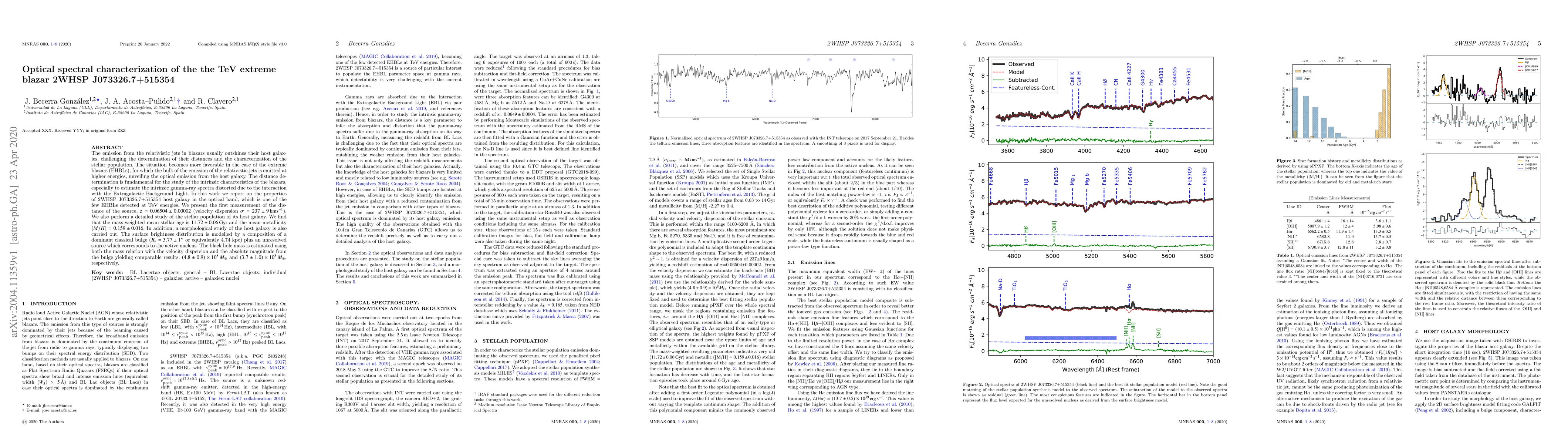 The emission from the relativistic jets in blazars usually outshines their host galaxies, challenging the determination of their distances and the characterization of the stellar population. The situation becomes more favorable in the case of the extreme blazars (EHBLs), for which the bulk of the emission of the relativistic jets is emitted at higher energies, unveiling the optical emission from the host galaxy. The distance determination is fundamental for the study of the intrinsic characteristics of the blazars, especially to estimate the intrinsic gamma-ray spectra distorted due to the interaction with the Extragalactic Background Light. In this work we report on the properties of 2WHSP~J073326.7+515354 host galaxy in the optical band, which is one of the few EHBLs detected at TeV energies. We present the first measurement of the distance of the source, $\mathrm{z}=0.06504\pm0.00002$ (velocity dispersion $\sigma=237 \pm 9\,\mathrm{km s^{-1}}$). We also perform a detailed study of the stellar population of its host galaxy. We find that the mass-weighted mean stellar age is $11.72\pm0.06\,\mathrm{Gyr}$ and the mean metallicity $[M/H]=0.159 \pm 0.016$. In addition, a morphological study of the host galaxy is also carried out. The surface brightness distribution is modelled by a composition of a dominant classical bulge ($R_e=3.77\pm1\arcsec $ or equivalently 4.74~kpc) plus an unresolved source which corresponds to the active nucleus. The black hole mass is estimated using both the mass relation with the velocity dispersion and the absolute magnitude from the bulge yielding comparable results: $(4.8\pm0.9)\times10^8\,M_{\odot}$ and $(3.7\pm1.0)\times10^8\,M_{\odot}$, respectively.