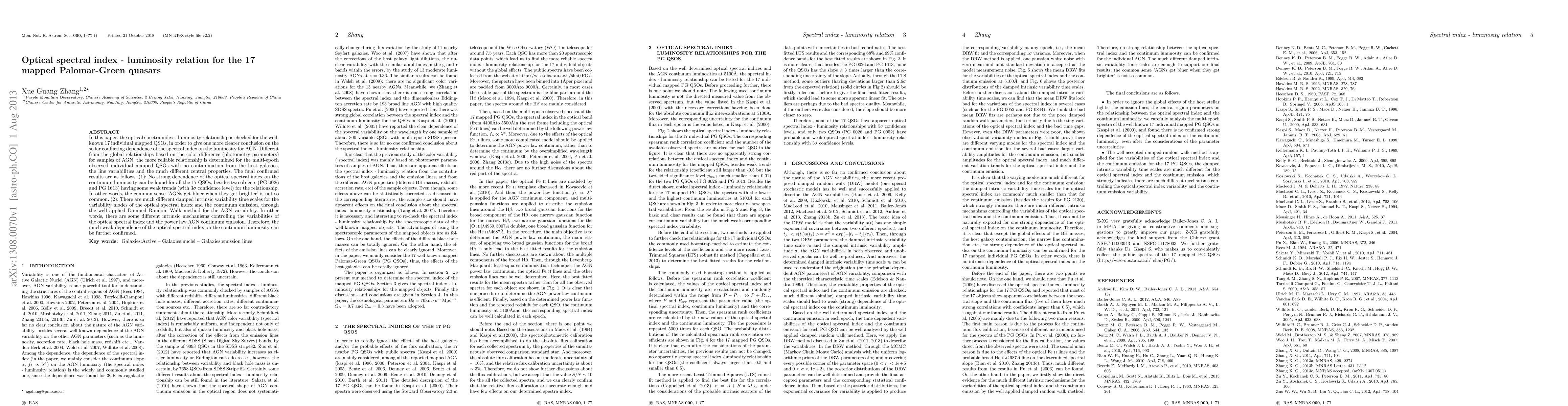 In this paper, the optical spectra index - luminosity relationship is checked for the well-known 17 individual mapped QSOs, in order to give one more clearer conclusion on the so far conflicting dependence of the spectral index on the luminosity for AGN. Different from the global relationships based on the color difference (photometry parameters) for samples of AGN, the more reliable relationship is determined for the multi-epoch observed individual mapped QSOs with no contamination from the host galaxies, the line variabilities and the much different central properties. The final confirmed results are as follows. (1): No strong dependence of the optical spectral index on the continuum luminosity can be found for all the 17 QSOs, besides two objects (PG 0026 and PG 1613) having some weak trends (with $3\sigma$ confidence level) for the relationship. In other words, the common sense 'AGNs get bluer when they get brighter' is not so common. (2): There are much different damped intrinsic variability time scales for the variability modes of the optical spectral index and the continuum emission, through the well applied Damped Random Walk method for the AGN variability. In other words, there are some different intrinsic mechanisms controlling the variabilities of the optical spectral index and the power law AGN continuum emission. Therefore, the much weak dependence of the optical spectral index on the continuum luminosity can be further confirmed.