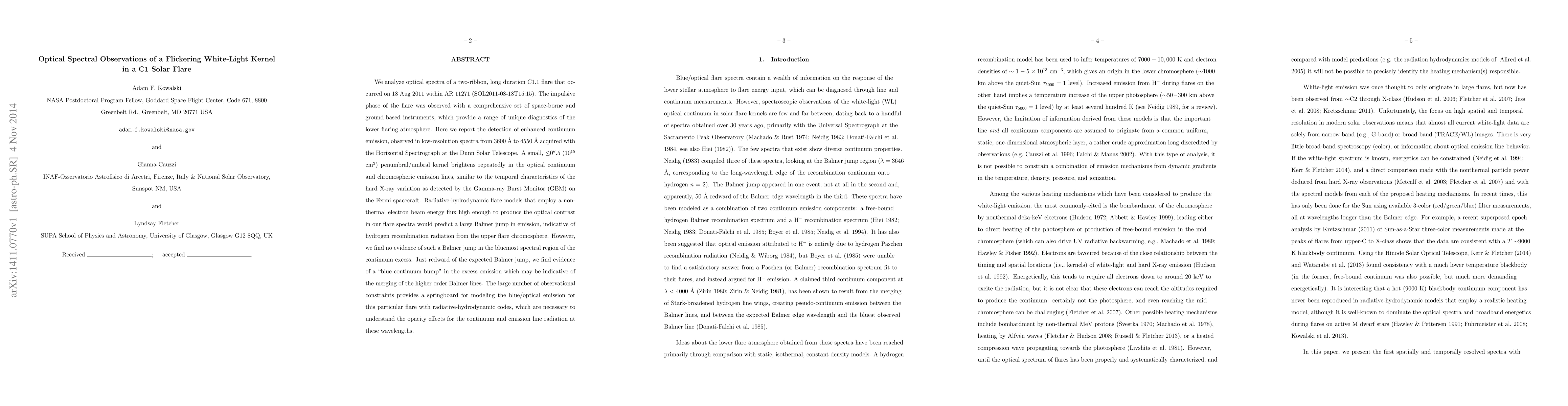 We analyze optical spectra of a two-ribbon, long duration C1.1 flare that occurred on 18 Aug 2011 within AR 11271 (SOL2011-08-18T15:15). The impulsive phase of the flare was observed with a comprehensive set of space-borne and ground-based instruments, which provide a range of unique diagnostics of the lower flaring atmosphere. Here we report the detection of enhanced continuum emission, observed in low-resolution spectra from 3600 \AA\ to 4550 \AA\ acquired with the Horizontal Spectrograph at the Dunn Solar Telescope. A small, $\le$0''.5 ($10^{15}$ cm$^2$) penumbral/umbral kernel brightens repeatedly in the optical continuum and chromospheric emission lines, similar to the temporal characteristics of the hard X-ray variation as detected by the Gamma-ray Burst Monitor (GBM) on the Fermi spacecraft. Radiative-hydrodynamic flare models that employ a nonthermal electron beam energy flux high enough to produce the optical contrast in our flare spectra would predict a large Balmer jump in emission, indicative of hydrogen recombination radiation from the upper flare chromosphere. However, we find no evidence of such a Balmer jump in the bluemost spectral region of the continuum excess. Just redward of the expected Balmer jump, we find evidence of a "blue continuum bump" in the excess emission which may be indicative of the merging of the higher order Balmer lines. The large number of observational constraints provides a springboard for modeling the blue/optical emission for this particular flare with radiative-hydrodynamic codes, which are necessary to understand the opacity effects for the continuum and emission line radiation at these wavelengths.