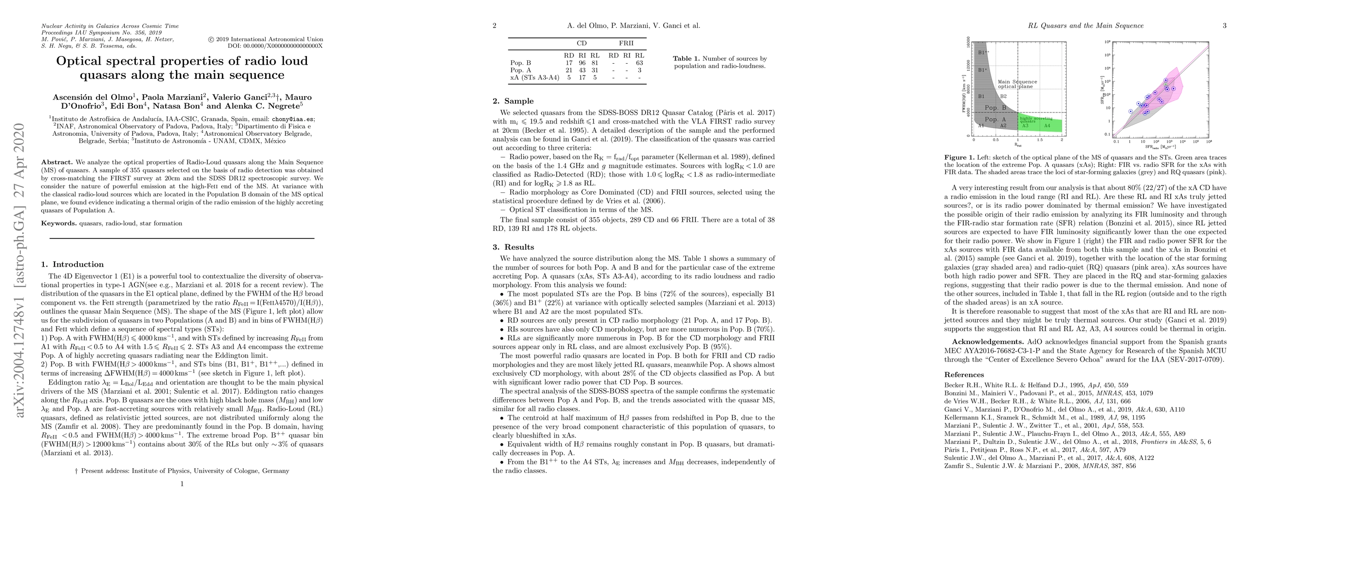 We analyze the optical properties of Radio-Loud quasars along the Main Sequence (MS) of quasars. A sample of 355 quasars selected on the basis of radio detection was obtained by cross-matching the FIRST survey at 20cm and the SDSS DR12 spectroscopic survey. We consider the nature of powerful emission at the high-FeII end of the MS. At variance with the classical radio-loud sources which are located in the Population B domain of the MS optical plane, we found evidence indicating a thermal origin of the radio emission of the highly accreting quasars of Population A.