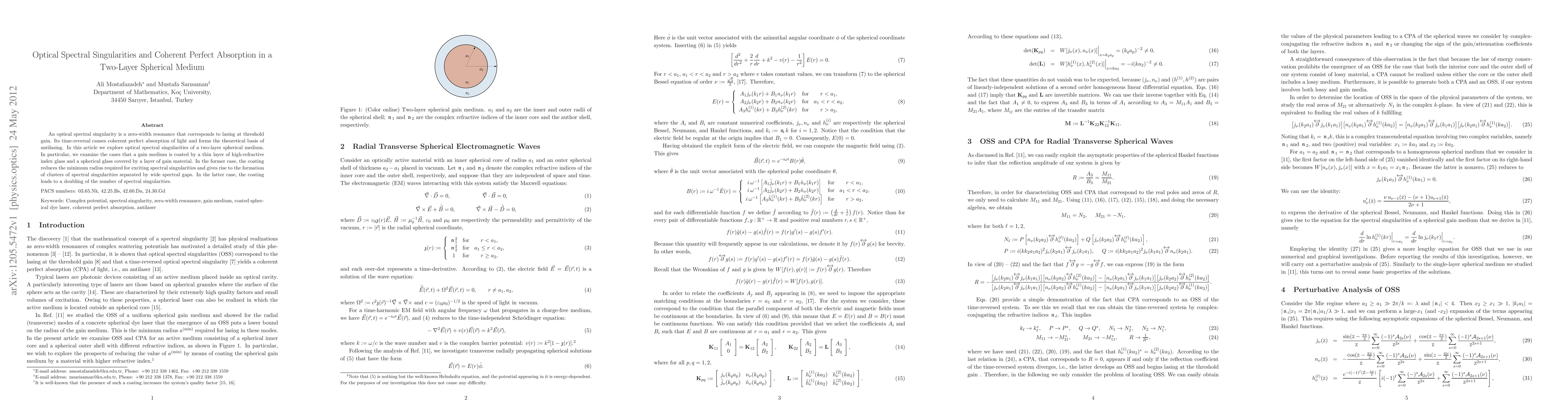 An optical spectral singularity is a zero-width resonance that corresponds to lasing at threshold gain. Its time-reversal causes coherent perfect absorption of light and forms the theoretical basis of antilasing. In this article we explore optical spectral singularities of a two-layer spherical medium. In particular, we examine the cases that a gain medium is coated by a thin layer of high-refractive index glass and a spherical glass covered by a layer of gain material. In the former case, the coating reduces the minimum radius required for exciting spectral singularities and gives rise to the formation of clusters of spectral singularities separated by wide spectral gaps. In the latter case, the coating leads to a doubling of the number of spectral singularities.