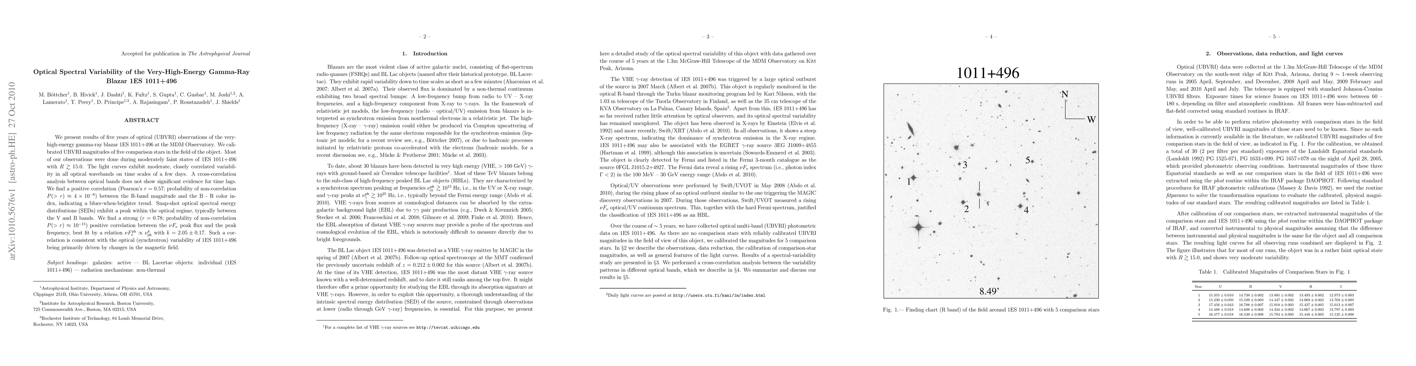 We present results of five years of optical (UBVRI) observations of the very-high-energy gamma-ray blazar 1ES 1011+496 at the MDM Observatory. We calibrated UBVRI magnitudes of five comparison stars in the field of the object. Most of our observations were done during moderately faint states of 1ES 1011+496 with R > 15.0. The light curves exhibit moderate, closely correlated variability in all optical wavebands on time scales of a few days. A cross-correlation analysis between optical bands does not show significant evidence for time lags. We find a positive correlation (Pearson's r = 0.57; probability of non-correlation P(>r) ~ 4e-8) between the R-band magnitude and the B - R color index, indicating a bluer-when-brighter trend. Snap-shot optical spectral energy distributions (SEDs) exhibit a peak within the optical regime, typically between the V and B bands. We find a strong (r = 0.78; probability of non-correlation P (>r) ~ 1e-15) positive correlation between the peak flux and the peak frequency, best fit by a relation $\nu F_{\nu}^{\rm pk} \propto \nu_{\rm pk}^k$ with k = 2.05 +/- 0.17. Such a correlation is consistent with the optical (synchrotron) variability of 1ES 1011+496 being primarily driven by changes in the magnetic field.
