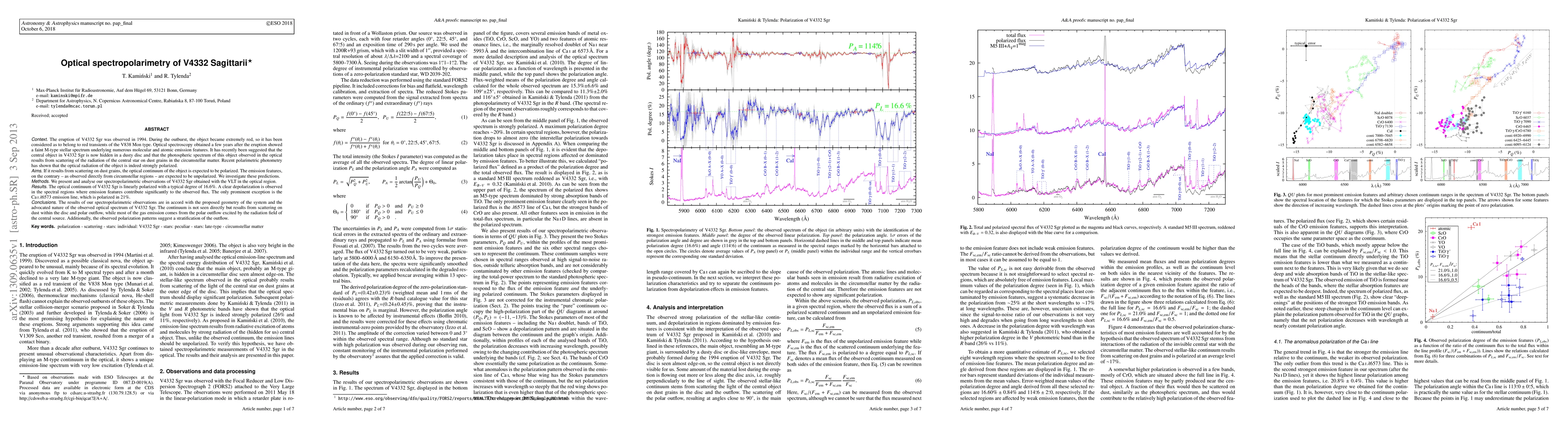 The eruption of V4332 Sgr was observed in 1994. During the outburst, the object became extremely red, so it has been considered as to belong to red transients of the V838 Mon type. Optical spectroscopy obtained a few years after the eruption showed a faint M-type stellar spectrum underlying numerous molecular and atomic emission features. It has recently been suggested that the central object in V4332 Sgr is now hidden in a dusty disc and that the photospheric spectrum of this object observed in the optical results from scattering of the radiation of the central star on dust grains in the circumstellar matter. Recent polarimetric photometry has shown that the optical radiation of the object is indeed strongly polarized. We present and analyse our spectropolarimetric observations of V4332 Sgr obtained with the VLT in the optical region. The optical continuum of V4332 Sgr is linearly polarized with a typical degree of 16.6%. A clear depolarization is observed in the spectral regions where emission features contribute significantly to the observed flux. The only prominent exception is the CaI 6573 emission line, which is polarized in 21%. The results of our spectropolarimetric observations are in accord with the proposed geometry of the system and the advocated nature of the observed optical spectrum of V4332 Sgr. The continuum is not seen directly but results from scattering on dust within the disc and polar outflow, while most of the gas emission comes from the polar outflow excited by the radiation field of the central source. Additionally, the observed polarization patterns suggest a stratification of the outflow.