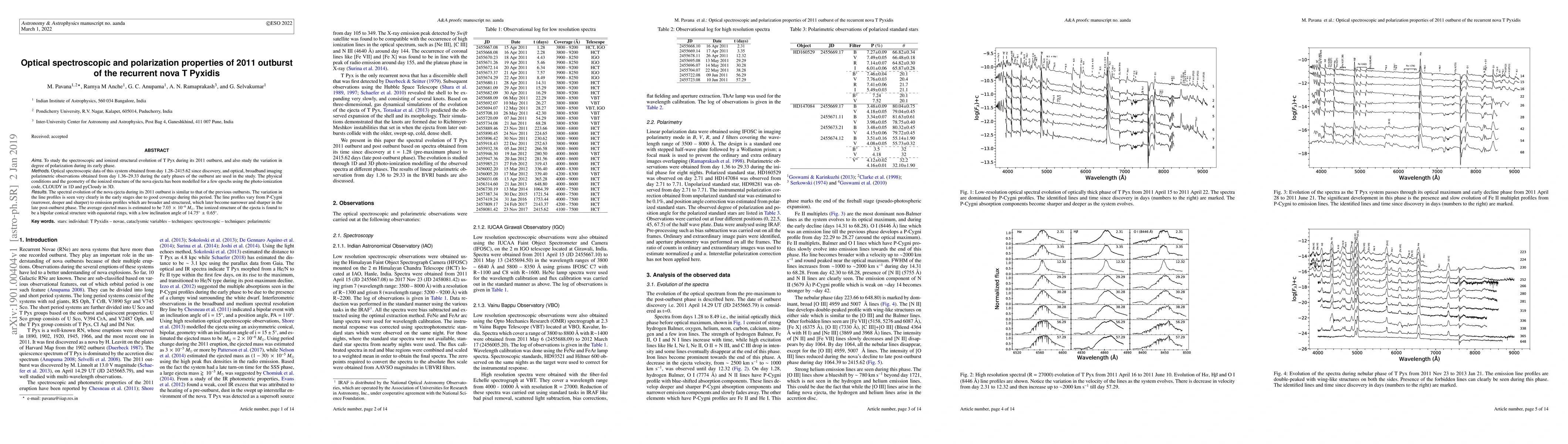 We study the spectroscopic and ionized structural evolution of T Pyx during its 2011 outburst, and also study the variation in degree of polarization during its early phase. Optical spectroscopic data of this system obtained from day 1.28--2415.62 since discovery, and optical, broadband imaging polarimetric observations obtained from day 1.36--29.33 during the early phases of the outburst are used in the study. The physical conditions and the geometry of the ionized structure of the nova ejecta has been modelled for a few epochs using the photo-ionization code, CLOUDY in 1D and pyCloudy in 3D. The spectral evolution of the nova ejecta during its 2011 outburst is similar to that of the previous outbursts. The variation in the line profiles is seen very clearly in the early stages due to good coverage during this period. The line profiles vary from P-Cygni (narrower, deeper and sharper) to emission profiles which are broader and structured, which later become narrower and sharper in the late post-outburst phase. The average ejected mass is estimated to be $7.03\, \times\, 10^{-6}\, M_{\odot}$. The ionized structure of the ejecta is found to be a bipolar conical structure with equatorial rings, with a low inclination angle of $14.75^\circ\, \pm\, 0.65^\circ$.