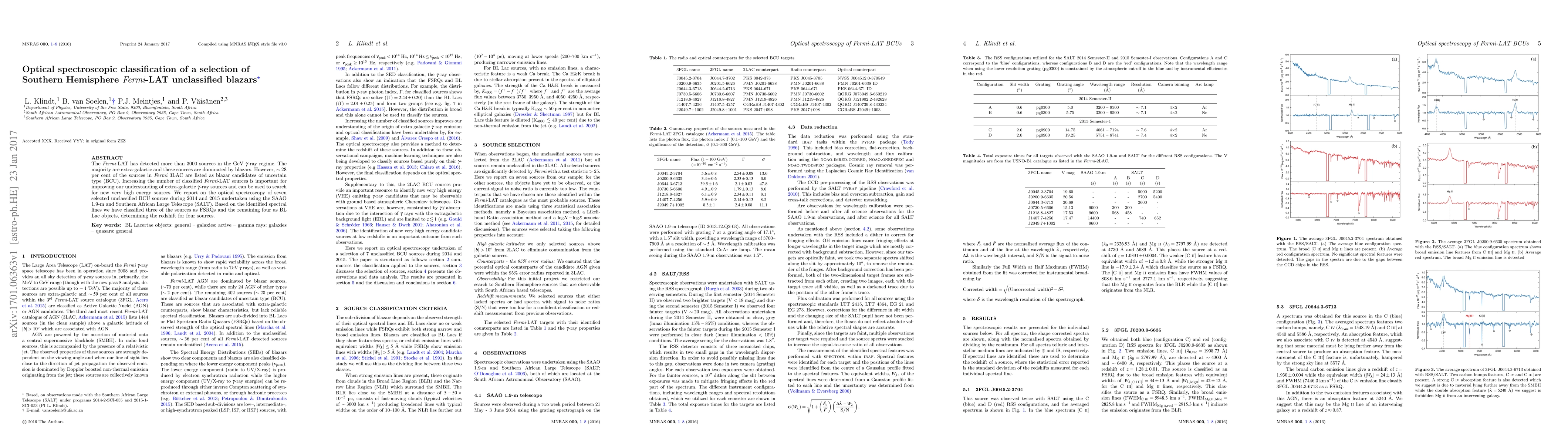 The Fermi-LAT has detected more than 3000 sources in the GeV $\gamma$-ray regime. The majority are extra-galactic and these sources are dominated by blazars. However, $\sim28$ per cent of the sources in Fermi 3LAC are listed as blazar candidates of uncertain type (BCU). Increasing the number of classified Fermi-LAT sources is important for improving our understanding of extra-galactic $\gamma$-ray sources and can be used to search for new very high energy sources. We report on the optical spectroscopy of seven selected unclassified BCU sources during 2014 and 2015 undertaken using the SAAO 1.9-m and Southern African Large Telescope (SALT). Based on the identified spectral lines we have classified three of the sources as FSRQs and the remaining four as BL Lac objects, determining the redshift for four sources.
