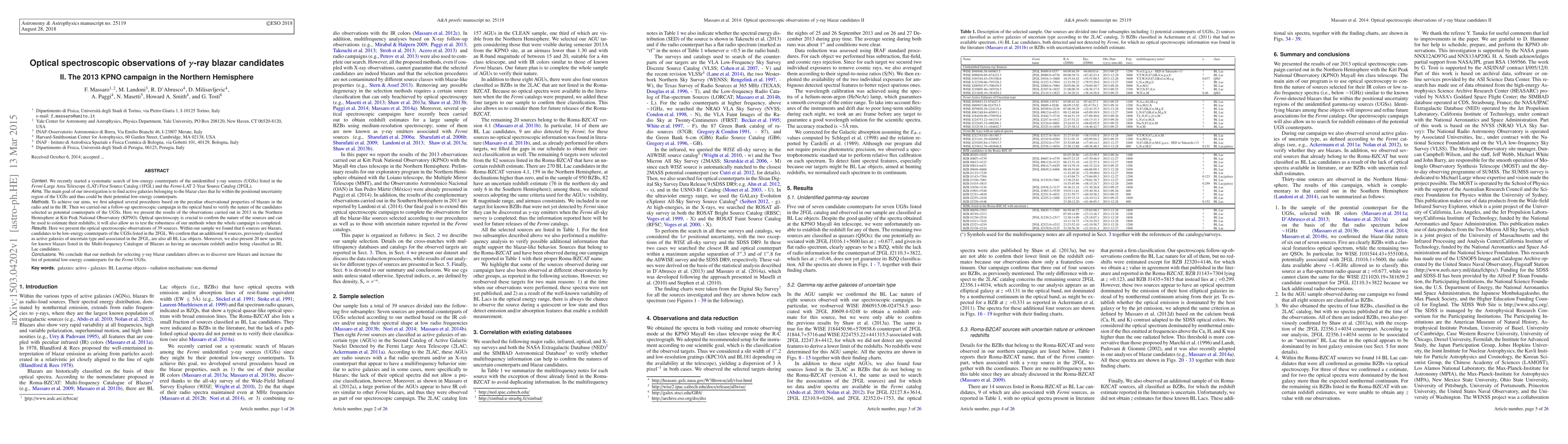 We recently started a systematic search of low-energy counterparts of the unidentified gamma-ray sources (UGSs) listed in the Fermi-Large Area Telescope (LAT) First Source Catalog (1FGL) and the Fermi-LAT 2-Year Source Catalog (2FGL).} The main goal of our investigation is to find active galaxies belonging to the blazar class that lie within the positional uncertainty region of the UGSs and thus could be their potential low-energy counterparts. To achieve our aims, we first adopted several procedures based on the peculiar observational properties of blazars in the radio and in the IR. Then we carried out a follow-up spectroscopic campaign in the optical band to verify the nature of the candidates selected as potential counterparts of the UGSs. Here we present the results of the observations carried out in 2013 in the Northern Hemisphere at Kitt Peak National Observatory (KPNO). Optical spectroscopy is crucial to confirm the nature of the sources and can be used to estimate their redshifts; it will also allow us to test the robustness of our methods when the whole campaign is completed. Here we present the optical spectroscopic observations of 39 sources. Within our sample we found that 6 sources are blazars, candidates to be low-energy counterparts of the UGSs listed in the 2FGL. We confirm that an additional 8 sources, previously classified as active galaxies of uncertain type and associated in the 2FGL, are also all BL Lac objects. Moreover, we also present 20 new spectra for known blazars listed in the Multi-frequency Catalogue of Blazars as having an uncertain redshift and/or being classified as BL Lac candidates. We conclude that our methods for selecting gamma-ray blazar candidates allows us to discover new blazars and increase the list of potential low-energy counterparts for the Fermi UGSs.
