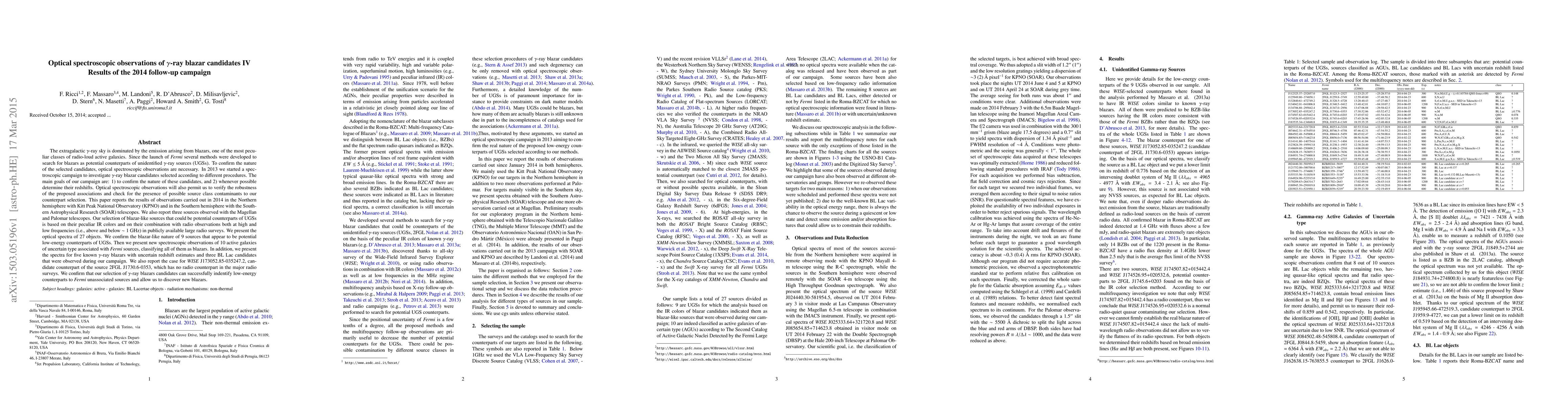 The extragalactic gamma-ray sky is dominated by the emission arising from blazars, one of the most peculiar classes of radio-loud active galaxies. Since the launch of Fermi several methods were developed to search for blazars as potential counterparts of unidentified gamma-ray sources (UGSs). To confirm the nature of the selected candidates, optical spectroscopic observations are necessary. In 2013 we started a spectroscopic campaign to investigate gamma-ray blazar candidates selected according to different procedures. The main goals of our campaign are: 1) to confirm the nature of these candidates, and 2) whenever possible determine their redshifts. Optical spectroscopic observations will also permit us to verify the robustness of the proposed associations and check for the presence of possible source class contaminants to our counterpart selection. This paper reports the results of observations carried out in 2014 in the Northern hemisphere with Kitt Peak National Observatory (KPNO) and in the Southern hemisphere with the Southern Astrophysical Research (SOAR) telescopes. We also report three sources observed with the Magellan and Palomar telescopes. Our selection of blazar-like sources that could be potential counterparts of UGSs is based on their peculiar IR colors and on their combination with radio observations both at high and low frequencies (i.e., above and below ~ 1 GHz) in publicly available large radio surveys. We present the optical spectra of 27 objects. [....] We also report the case for WISE J173052.85-035247.2, candidate counterpart of the source 2FGL J1730.6-0353, which has no radio counterpart in the major radio surveys. We confirm that our selection of gamma-ray blazars candidates can successfully indentify low-energy counterparts to Fermi unassociated sources and allow us to discover new blazars.