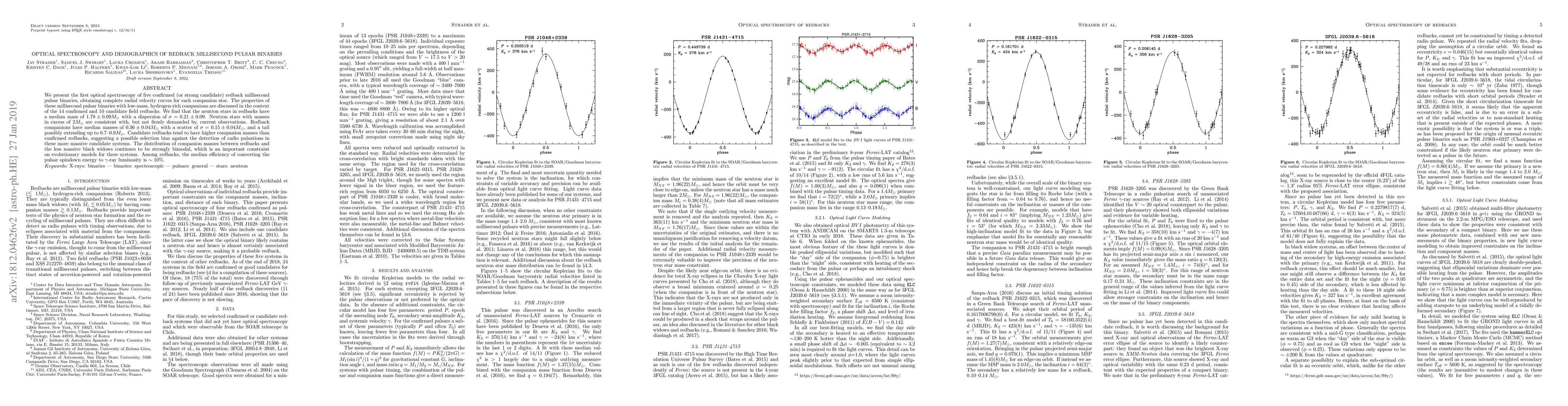 We present the first optical spectroscopy of five confirmed (or strong candidate) redback millisecond pulsar binaries, obtaining complete radial velocity curves for each companion star. The properties of these millisecond pulsar binaries with low-mass, hydrogen-rich companions are discussed in the context of the 14 confirmed and 10 candidate field redbacks. We find that the neutron stars in redbacks have a median mass of 1.78 +/- 0.09 M_sun with a dispersion of sigma = 0.21 +/- 0.09. Neutron stars with masses in excess of 2 M_sun are consistent with, but not firmly demanded by, current observations. Redback companions have median masses of 0.36 +/- 0.04 M_sun with a scatter of sigma = 0.15 +/- 0.04, and a tail possibly extending up to 0.7-0.9 M_sun. Candidate redbacks tend to have higher companion masses than confirmed redbacks, suggesting a possible selection bias against the detection of radio pulsations in these more massive candidate systems. The distribution of companion masses between redbacks and the less massive black widows continues to be strongly bimodal, which is an important constraint on evolutionary models for these systems. Among redbacks, the median efficiency of converting the pulsar spindown energy to gamma-ray luminosity is ~10%.