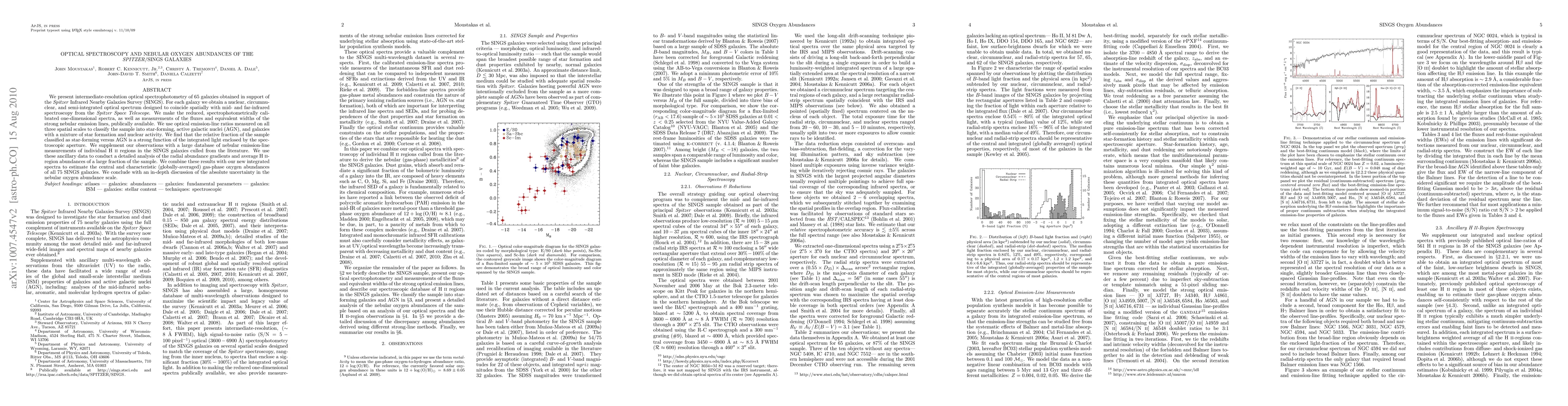 This paper presents optical spectroscopy of 65 galaxies from the Spitzer Infrared Nearby Galaxies Survey (SINGS), classifying them based on star formation and AGN activity, and estimating their gas-phase oxygen abundances. It also discusses the uncertainties in the nebular oxygen abundance scale.