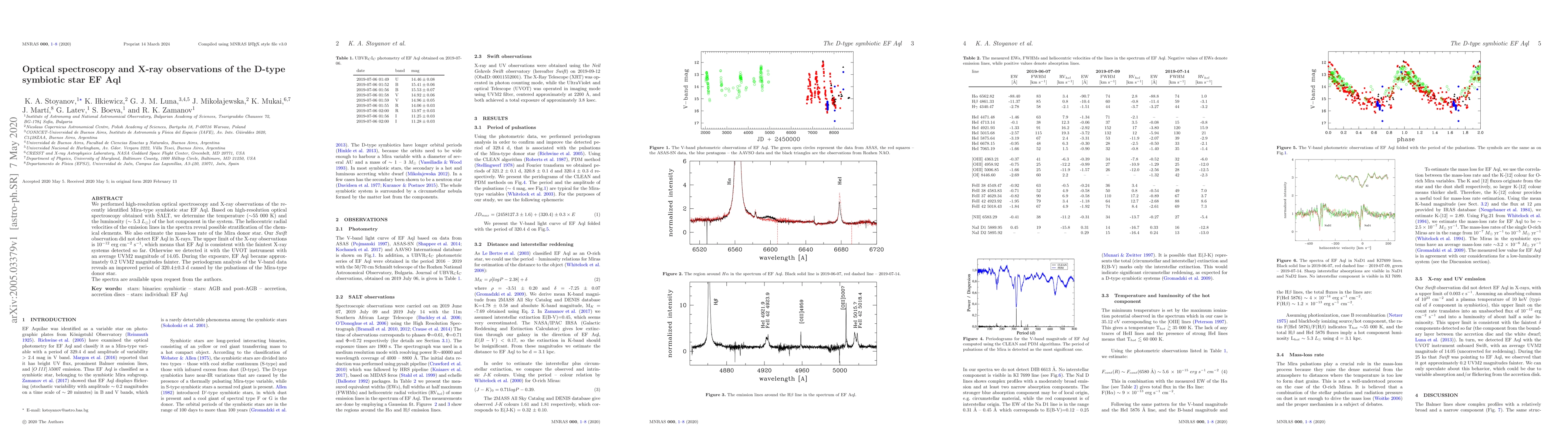 We performed high-resolution optical spectroscopy and X-ray observations of the recently identified Mira-type symbiotic star EF Aql. Based on high-resolution optical spectroscopy obtained with SALT, we determine the temperature ($\sim $55 000 K) and the luminosity ($\sim$ 5.3 $L_\odot$) of the hot component in the system. The heliocentric radial velocities of the emission lines in the spectra reveal possible stratification of the chemical elements. We also estimate the mass-loss rate of the Mira donor star. Our Swift observation did not detect EF Aql in X-rays. The upper limit of the X-ray observations is 10$^{-12}$ erg cm$^{-2}$ s$^{-1}$, which means that EF Aql is consistent with the faintest X-ray systems detected so far. Otherwise we detected it with the UVOT instrument with an average UVM2 magnitude of 14.05. During the exposure, EF Aql became approximately 0.2 UVM2 magnitudes fainter. The periodogram analysis of the V-band data reveals an improved period of 320.4$\pm$0.3 d caused by the pulsations of the Mira-type donor star. The spectra are available upon request from the authors.