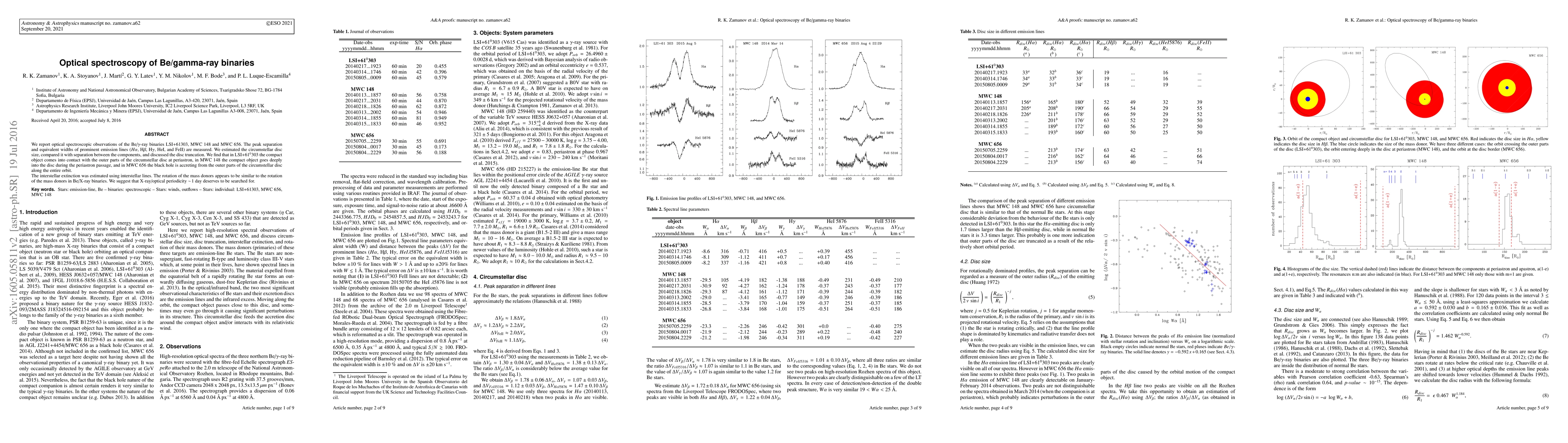 This study uses optical spectroscopy to observe Be/gamma-ray binaries, measuring line separation and equivalent widths to discuss the interaction between compact objects and circumstellar discs. It suggests that X-ray/optical periodicity may be present in these systems.