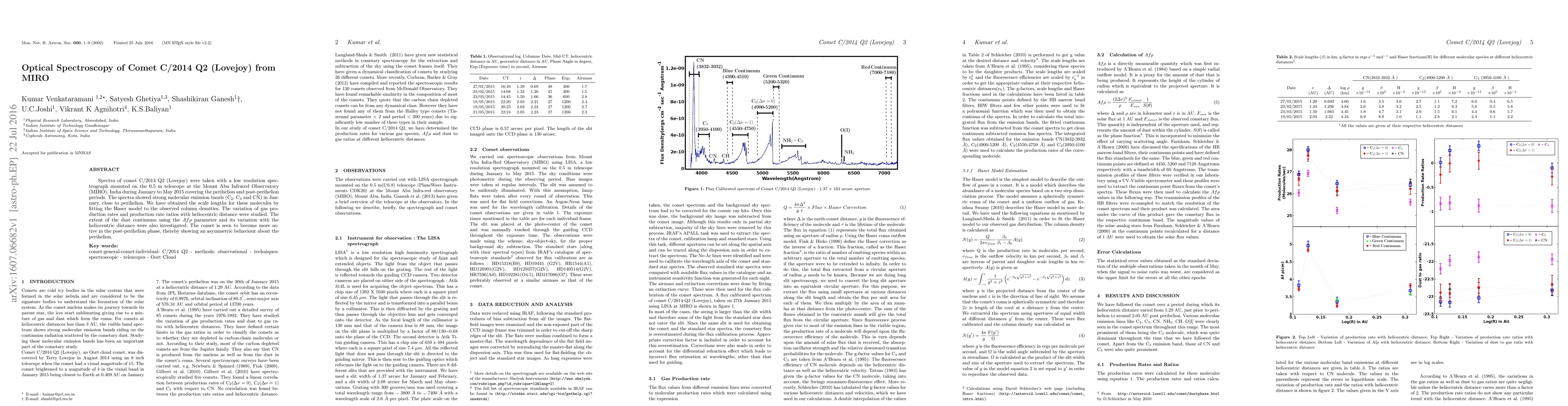 Spectra of comet C/2014 Q2 (Lovejoy) were taken with a low resolution spectrograph mounted on the 0.5 m telescope at the Mount Abu Infrared Observatory (MIRO), India during January to May 2015 covering the perihelion and post-perihelion periods. The spectra showed strong molecular emission bands (C2, C3 and CN) in January, close to perihelion. We have obtained the scale lengths for these molecules by fitting the Haser model to the observed column densities. The variation of gas production rates and production rate ratios with heliocentric distance were studied. The extent of the dust continuum using the Af-rho parameter and its variation with the heliocentric distance were also investigated. The comet is seen to become more active in the post-perihelion phase, thereby showing an asymmetric behaviour about the perihelion.