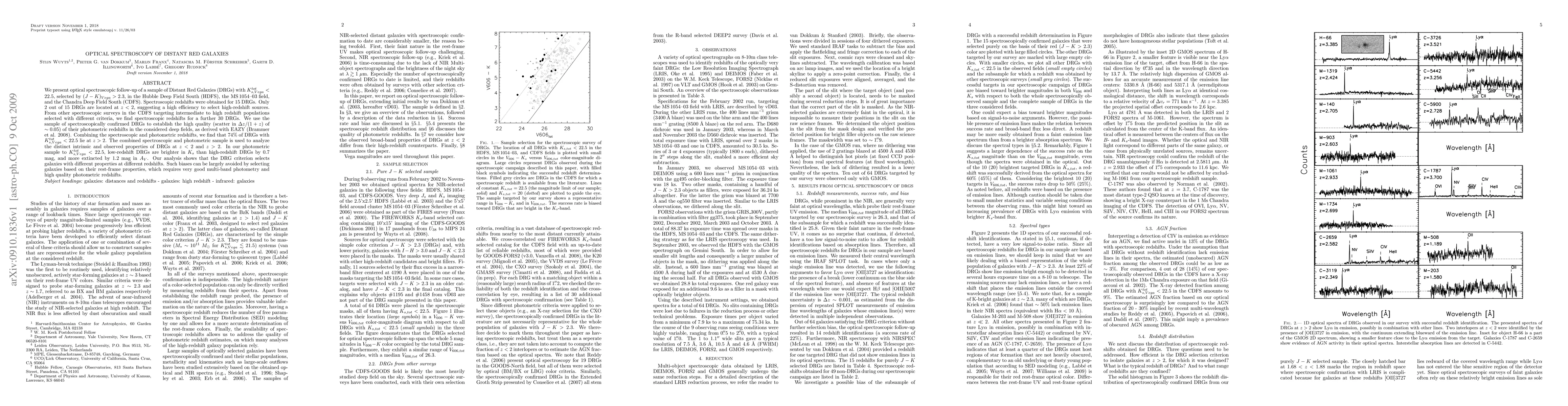 We present optical spectroscopic follow-up of a sample of Distant Red Galaxies (DRGs) with K < 22.5 (Vega), selected by J-K > 2.3, in the Hubble Deep Field South, the MS 1054-03 field, and the Chandra Deep Field South. Spectroscopic redshifts were obtained for 15 DRGs. Only 2 out of 15 DRGs are located at z < 2, suggesting a high efficiency to select high-redshift sources. From other spectroscopic surveys in the CDFS targeting intermediate to high redshift populations selected with different criteria, we find spectroscopic redshifts for a further 30 DRGs. We use the sample of spectroscopically confirmed DRGs to establish the high quality (scatter in \Delta z/(1+z) of ~ 0.05) of their photometric redshifts in the considered deep fields, as derived with EAZY (Brammer et al. 2008). Combining the spectroscopic and photometric redshifts, we find that 74% of DRGs with K < 22.5 lie at z > 2. The combined spectroscopic and photometric sample is used to analyze the distinct intrinsic and observed properties of DRGs at z < 2 and z > 2. In our photometric sample to K < 22.5, low-redshift DRGs are brighter in K than high-redshift DRGs by 0.7 mag, and more extincted by 1.2 mag in Av. Our analysis shows that the DRG criterion selects galaxies with different properties at different redshifts. Such biases can be largely avoided by selecting galaxies based on their rest-frame properties, which requires very good multi-band photometry and high quality photometric redshifts.