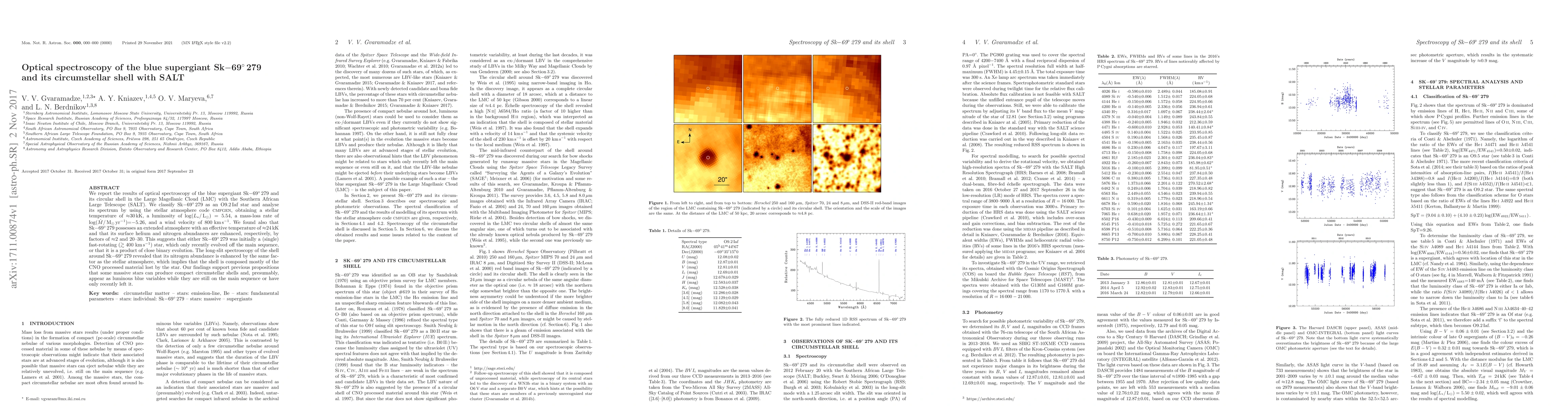 We report the results of optical spectroscopy of the blue supergiant Sk-69 279 and its circular shell in the Large Magellanic Cloud (LMC) with the Southern African Large Telescope (SALT). We classify Sk-69 279 as an O9.2 Iaf star and analyse its spectrum by using the stellar atmosphere code CMFGEN, obtaining a stellar temperature of \approx 30 kK, a luminosity of log(L_*/Lsun)=5.54, a mass-loss rate of log(\dot{M}/(Msun/yr))=-5.26, and a wind velocity of 800 km/s. We found also that Sk-69 279 possesses an extended atmosphere with an effective temperature of \approx 24 kK and that its surface helium and nitrogen abundances are enhanced, respectively, by factors of \approx 2 and 20--30. This suggests that either Sk-69 279 was initially a (single) fast-rotating (\ga 400 km/s) star, which only recently evolved off the main sequence, or that it is a product of close binary evolution. The long-slit spectroscopy of the shell around Sk-69 279 revealed that its nitrogen abundance is enhanced by the same factor as the stellar atmosphere, which implies that the shell is composed mostly of the CNO processed material lost by the star. Our findings support previous propositions that some massive stars can produce compact circumstellar shells and, presumably, appear as luminous blue variables while they are still on the main sequence or have only recently left it.