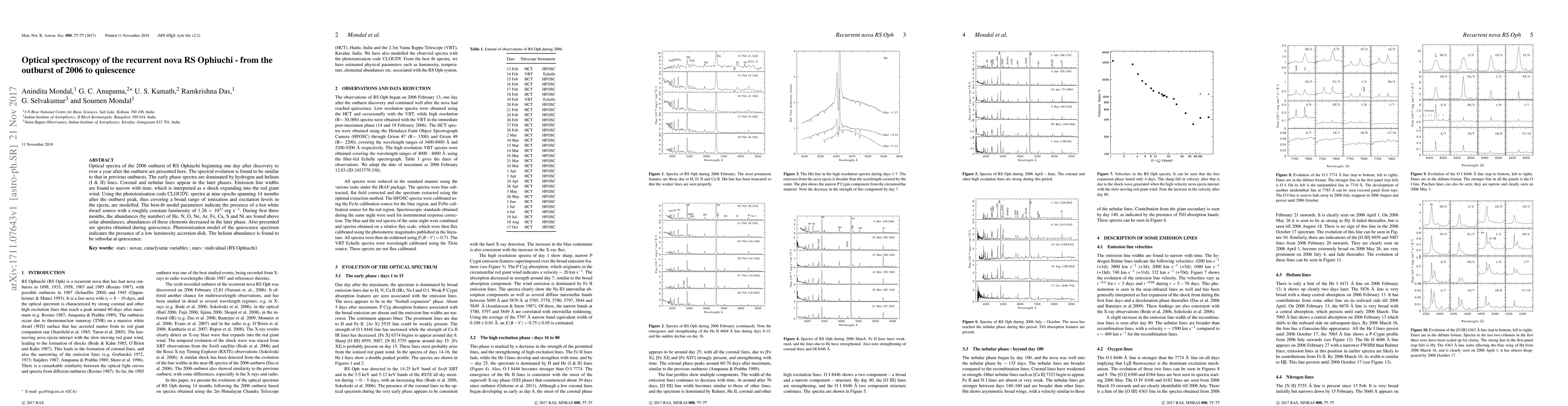 This study presents optical spectra of the recurrent nova RS Ophiuchi from the 2006 outburst to quiescence, showing spectral evolution similar to previous outbursts. The early phase spectra are dominated by hydrogen and helium lines, while later phases exhibit coronal and nebular lines, with emission line widths narrowing over time, indicating a shock expanding into the red giant wind.