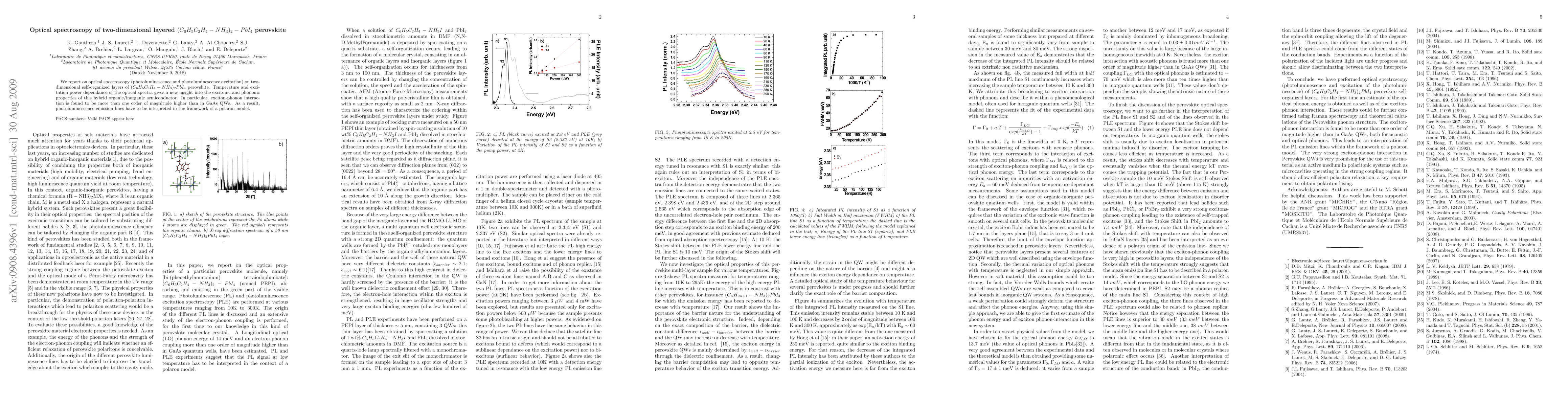 We report on optical spectroscopy (photoluminescence and photoluminescence excitation) on two-dimensional self-organized layers of $(C_{6}H_{5}C_{2}H_{4}-NH_{3})_{2}PbI_{4}$ perovskite. Temperature and excitation power dependance of the optical spectra gives a new insight into the excitonic and phononic properties of this hybrid organic/inorganic semiconductor. In particular, exciton-phonon interaction is found to be more than one order of magnitude higher than in GaAs QWs. As a result, photoluminescence emission lines have to be interpreted in the framework of a polaron model.