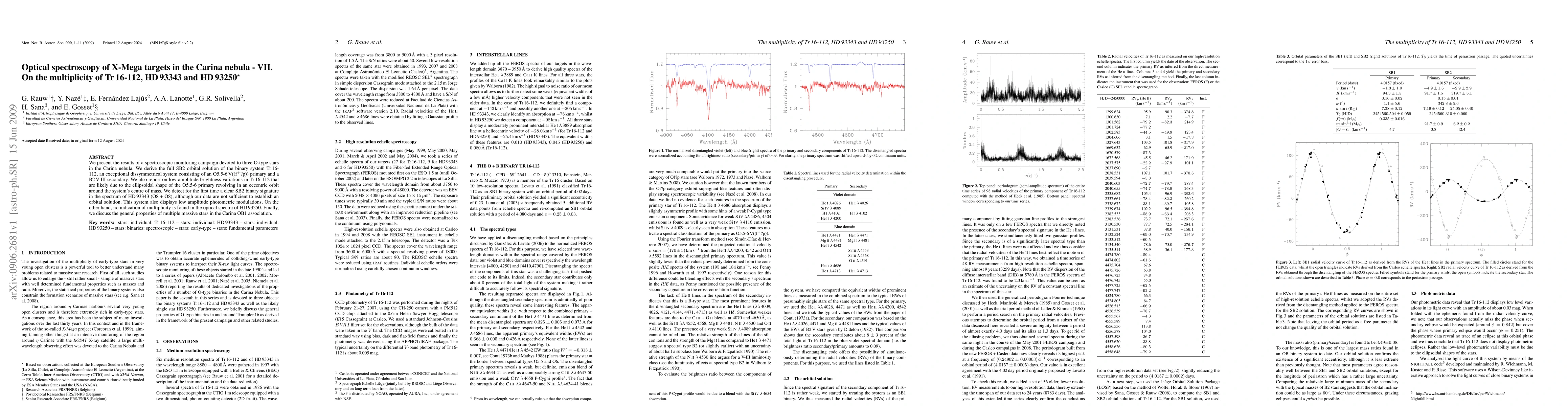This paper reports on spectroscopic monitoring of three O-type stars in the Carina nebula, revealing an SB2 binary system in Tr 16-112 with an O5.5-6V primary and a B2V-III secondary, and detecting an SB2 binary signature in HD 93343 (O8 + O8), while no multiplicity is found in HD 93250.