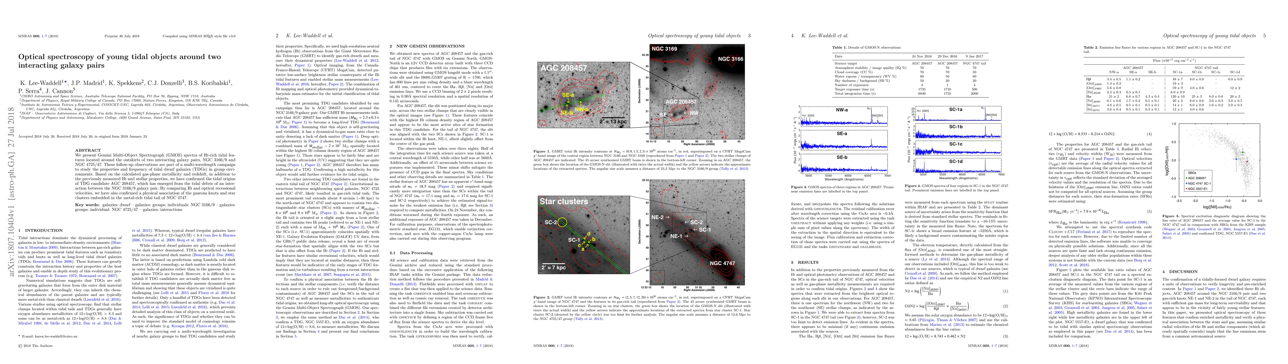 We present Gemini Multi-Object Spectrograph (GMOS) spectra of HI-rich tidal features located around the outskirts of two interacting galaxy pairs, NGC 3166/9 and NGC 4725/47. These follow-up observations are part of a multi-wavelength campaign to study the properties and frequency of tidal dwarf galaxies (TDGs) in group environments. Based on the calculated gas-phase metallicity and redshift, in addition to the previously measured HI and stellar properties, we have confirmed the tidal origins of TDG candidate AGC 208457, which has emerged from the tidal debris of an interaction between the NGC 3166/9 galaxy pair. By comparing HI and optical recessional velocities, we have also confirmed a physical association of the gaseous knots and star clusters embedded in the metal-rich tidal tail of NGC 4747.