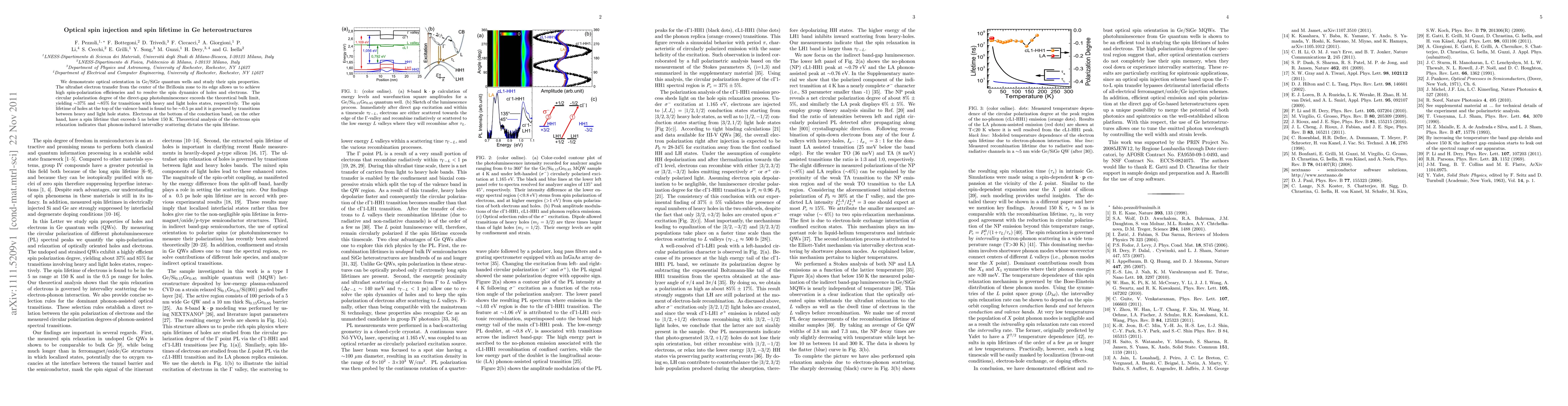 This paper investigates optical spin injection in Ge/SiGe quantum wells, achieving high spin-polarization efficiencies and resolving spin dynamics. The spin lifetime of holes is ~0.5 ps, while electrons exhibit a spin lifetime exceeding 5 ns below 150 K, primarily due to phonon-induced intervalley scattering.