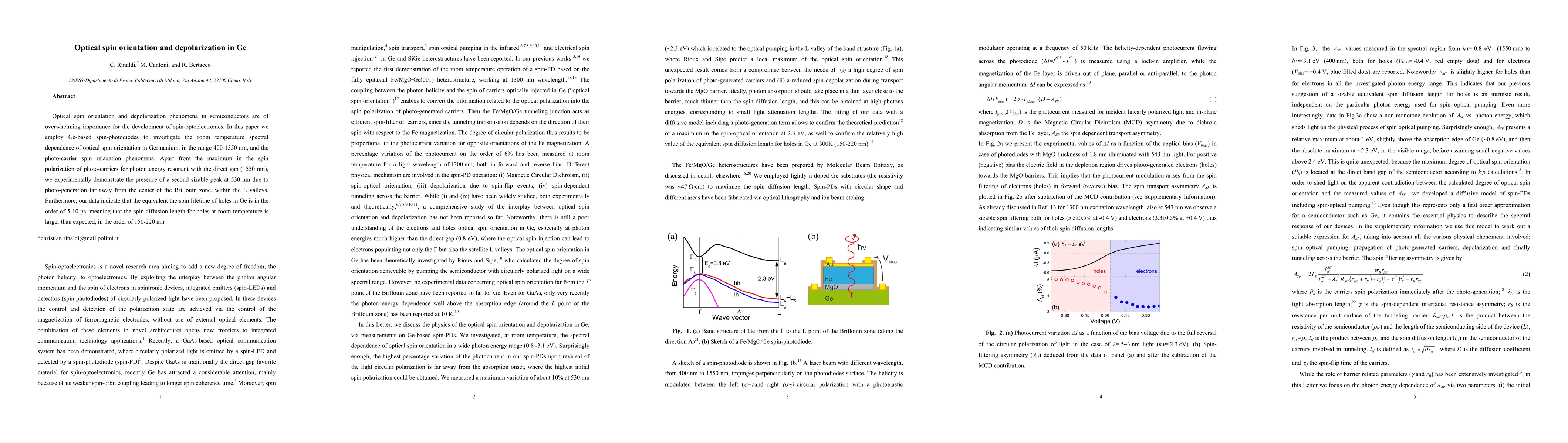 This paper investigates optical spin orientation and depolarization in Germanium using spin-photodiodes, revealing a second sizable peak in spin polarization at 530 nm due to photo-generation in L valleys. The study also finds that hole spin lifetimes are around 5-10 ps, leading to a surprisingly large spin diffusion length of 150-220 nm at room temperature.