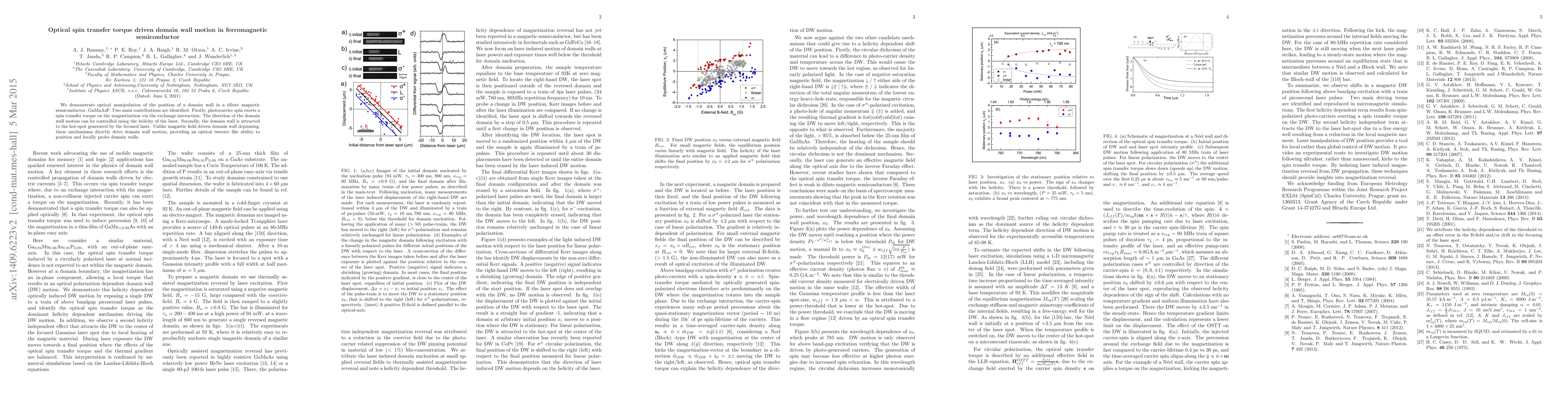 This study demonstrates optical manipulation of domain wall motion in GaMnAsP via spin transfer torque and localized heating, using laser helicity to control domain wall direction and laser focus to attract the wall, providing an optical tool for precise domain wall positioning.