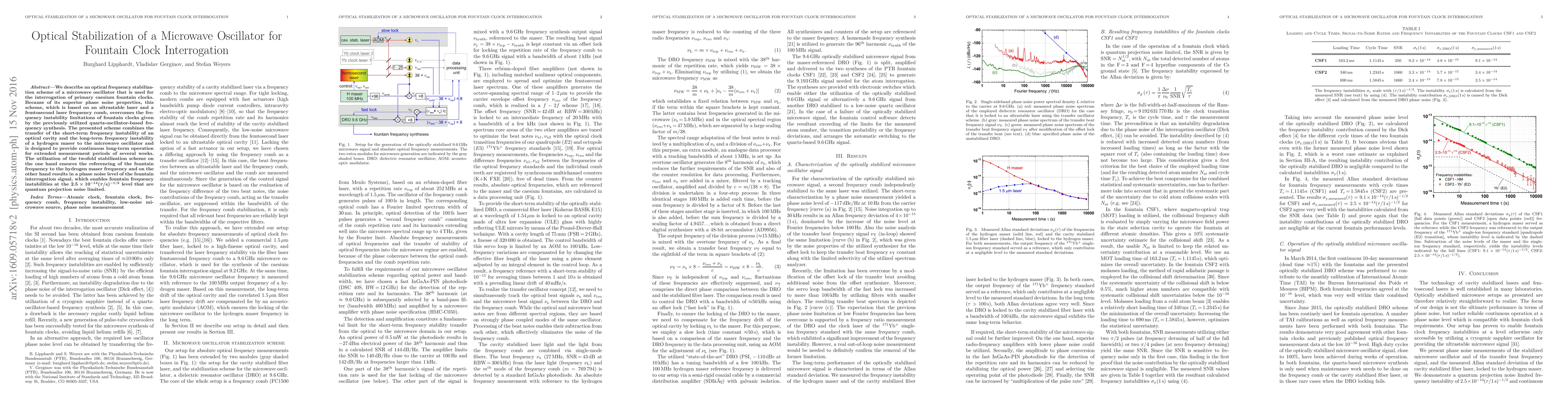 The paper introduces a novel optical stabilization scheme for microwave oscillators used in fountain clock interrogation, combining short-term optical cavity stability and long-term hydrogen maser stability.