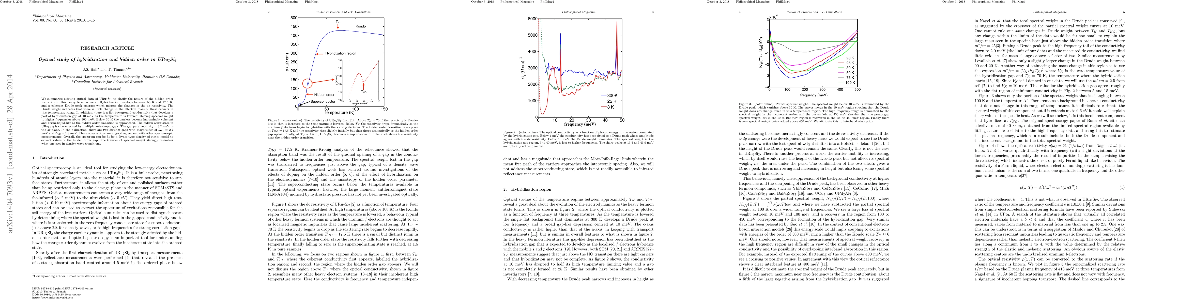 The research summarizes existing optical data of URu2Si2 to clarify the nature of the hidden order transition in this heavy fermion metal, employing optical spectroscopy to study hybridization and spectral weight transfer.