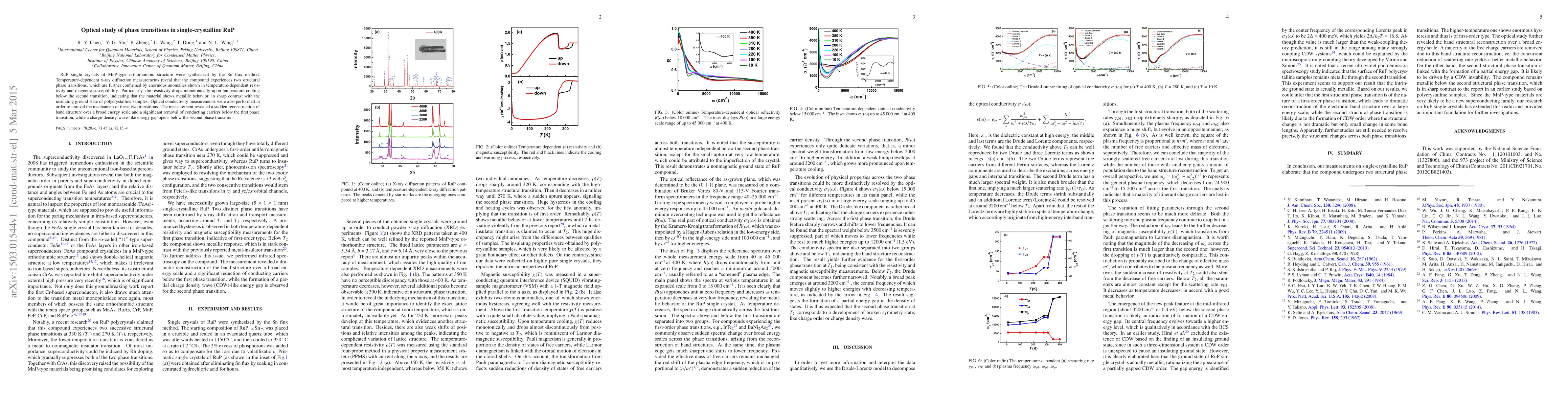 RuP single crystals of MnP-type orthorhombic structure were synthesized by the Sn flux method. Temperature-dependent x-ray diffraction measurements reveal that the compound experiences two structural phase transitions, which are further confirmed by enormous anomalies shown in temperature-dependent resistivity and magnetic susceptibility. Particularly, the resistivity drops monotonically upon temperature cooling below the second transition, indicating that the material shows metallic behavior, in sharp contrast with the insulating ground state of polycrystalline samples. Optical conductivity measurements were also performed in order to unravel the mechanism of these two transitions. The measurement revealed a sudden reconstruction of band structure over a broad energy scale and a significant removal of conducting carriers below the first phase transition, while a charge-density-wave-like energy gap opens below the second phase transition.